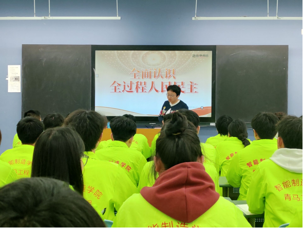 为深刻落实习近平新时代中国特色社会主义思想“十个明确”的要求,让青马学员们更好地理解“全过程人民民主”的政策方针,2024年4月26日下午,在勤学楼A区112教室智能制造学院干艳燕老师为智能制造学院第十四届青马班学员开展了以“全过程人民民主”为主题的授课。