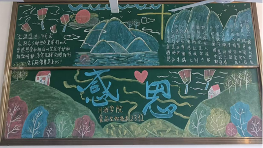在老师们的精心指导下,学生们充分利用课余时间,发挥想象设计图文并茂、布局美观的黑板报。每份板报的主题突出,版面形式多样、色彩搭配协调,加深同学们对“感恩”的认识和理解。