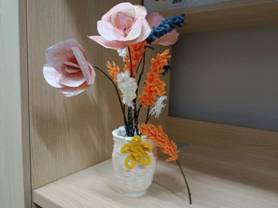 简介:我们的作品是一个盆栽,它由树枝,香飘飘纸杯,水果网,同学们余下的毛线废纸制作而成。主旨在发现生活中的事物,利用好自己身边的资源,真正做到回收利用。