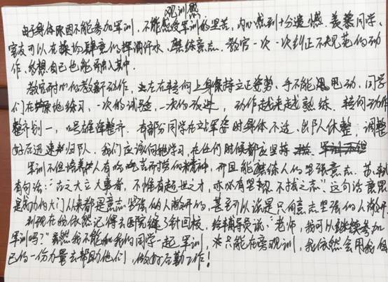 下午两点,正是训练场最热的时候。她一回到学校就到训练场报到,她说大学军训就一次,她不想错过,她要陪着同学们一起训练。她就坐在队伍的前面。认真地观摩,默默地为同学服务,写下自己的观训感。