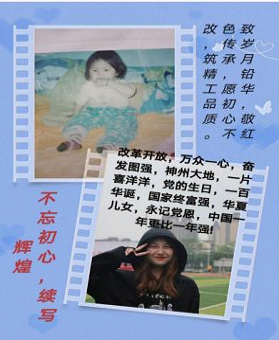 我们当代大学生大多数都为出生于千禧之年的新生代00后,他们的成长见证了我国的高速发展,同时又面临世界百年未有之大变局。今年,又值中国共产党成立100周年,更是“十四五”的开局之年,也是两个百年目标交汇与转换之年,机遇,挑战,危机并存。药品与环境工程学院团总支于2021年5月20日-26日开展“童心永向党,共筑中国梦”活动,结合“六一儿童节”,同学们晒出童年照,青春照,结合祝福语,见证、歌颂共和国的发展变化,体现我院青年学生对党和国家的热爱。