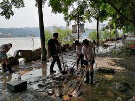 滨江路险情十分严峻,洪峰过境后,地下车库仍处于被淹状态,滨江路上到处是堆积的淤泥,完全看不出之前路段面貌。官兵、环保系统的救灾人员、政府救灾人员等正在及时做清淤工作。我们马上积极参与到清淤工作中,拿起铁锹,卷起裤腿,埋头苦干起来。“什么?你拿铲不动?别着急我来帮你!”团结就是力量,人多力量大!不一会儿,看着恢复原貌的路段,我们当时觉得能为泸州市抗洪救灾贡献一份自己的力量,真荣幸!