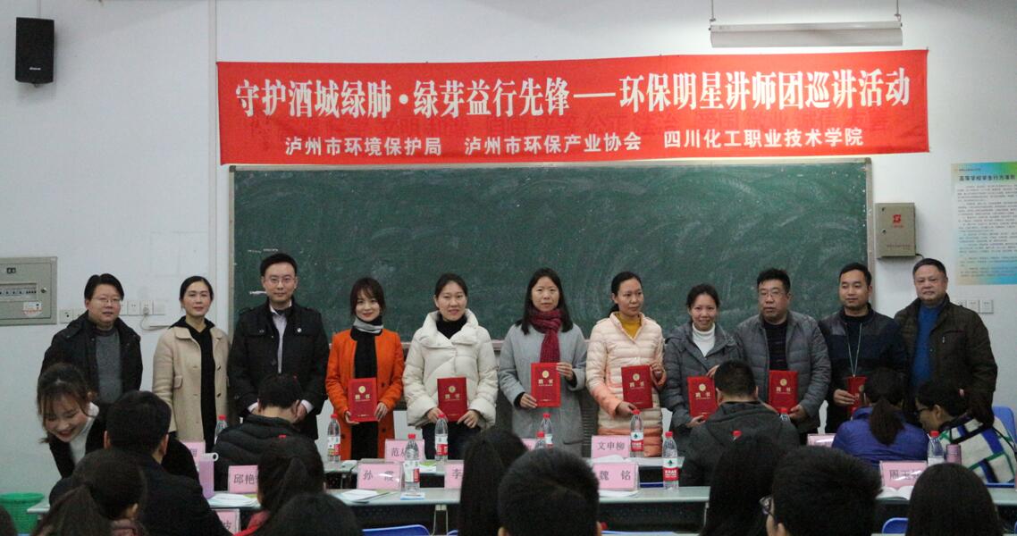 2018年12月5日是世界志愿者日,四川化院在行动。我院副院长文申柳,泸州市环境保护局党委书记赵晓琼分别为环保明星讲师团成员颁发了聘书,文院长亲自向学院环保志愿者代表授旗,并对志愿者们提出了殷切期望。
