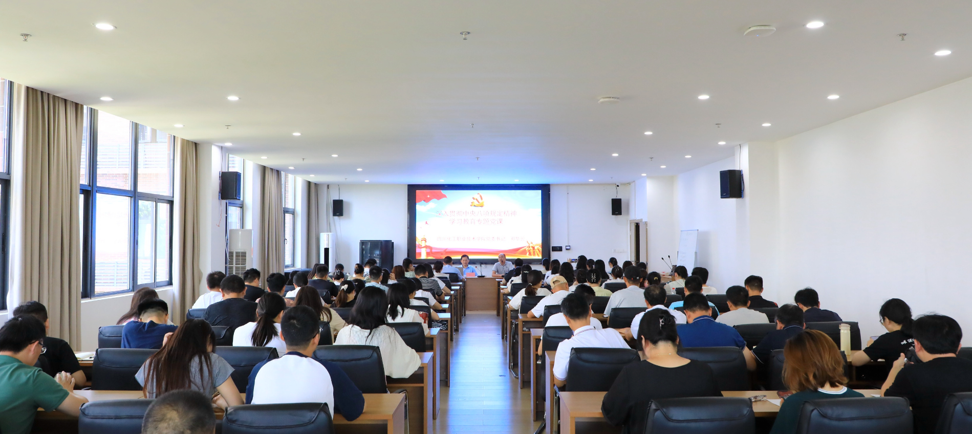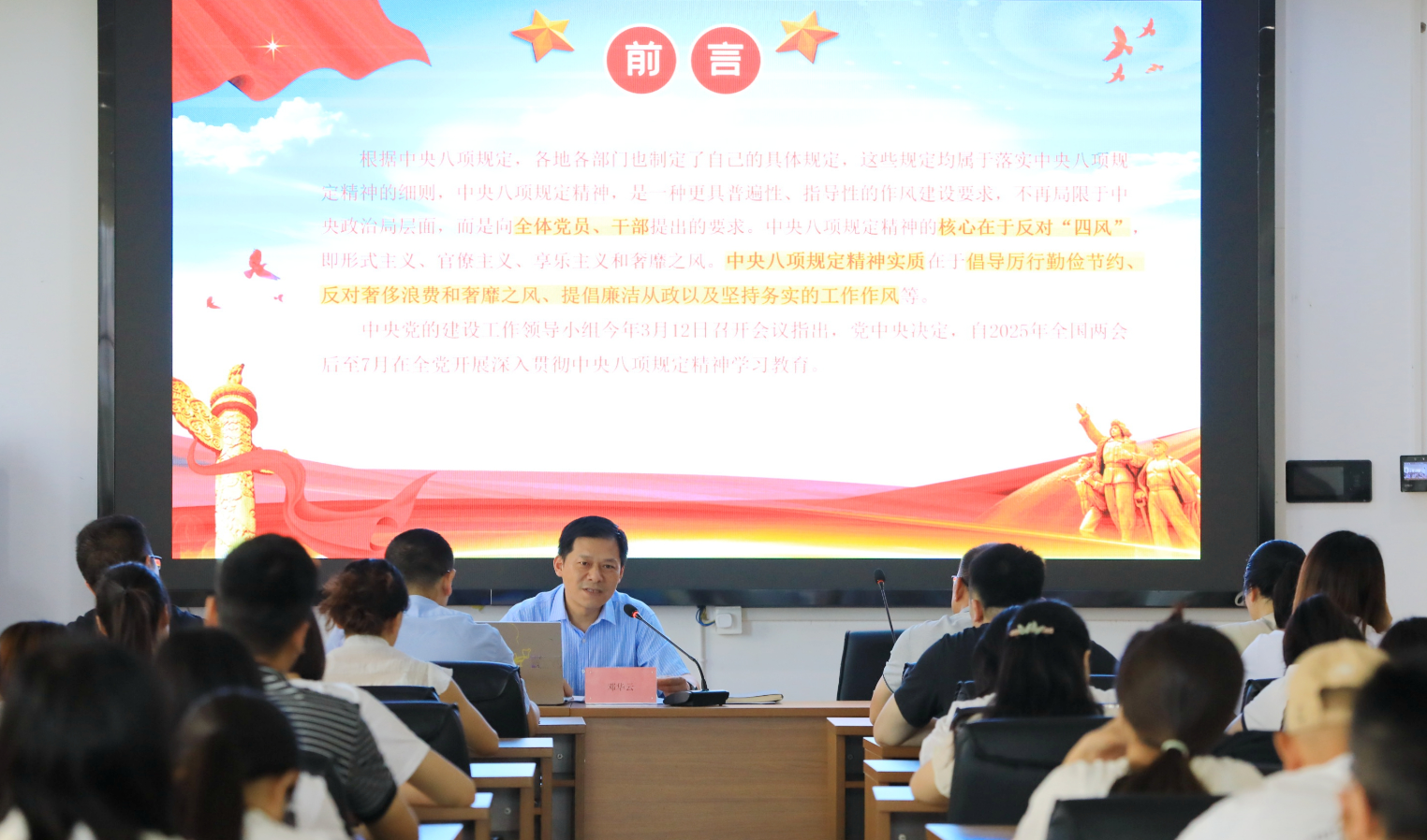 为深入贯彻落实习近平总书记关于党的自我革命的重要思想和中央八项规定精神,持续推进党的作风建设,2025年6月11日,学校党委书记邓华云以“锲而不舍贯彻中央八项规定精神,推进新时代党的作风建设”为题,为马克思主义学院直属党支部、基础部直属党支部、应用化工学院党总支全体党员上了一堂深刻的教育党课。