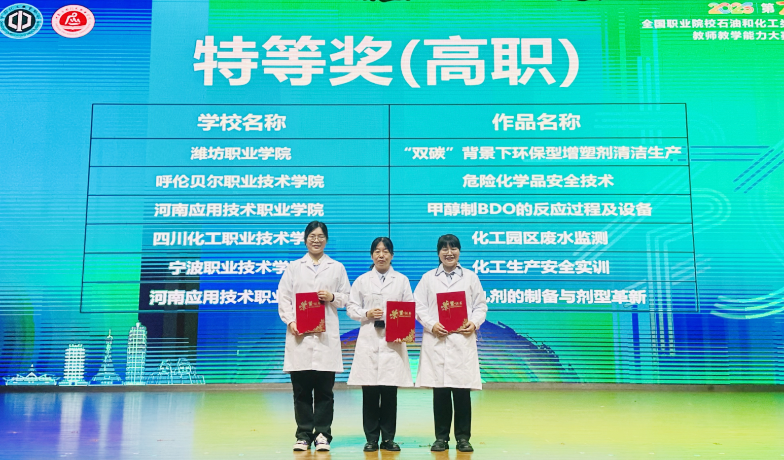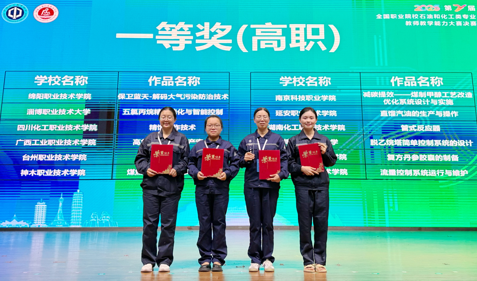 本次大赛采取网络初赛和现场决赛方式进行。初赛采取线上比赛形式,内容为化工职业教育课堂设计。决赛为现场化工职业教育课堂展示,设置无生教学展示、实训教学视频介绍和综合素养展示3个环节。决赛现场,学校4件作品深度融入虚拟仿真等数字化技术,融合企业真实生产案例进行生动展示,综合素养展示环节应对自如,展现出较强的专业性与创新性。经过激烈比赛,最终,学校陶凤、黄兰粉、邓晓慧、杨文豪(企业)团队的作品《化工园区废水监测》荣获“特等奖”,唐嘉、裴莹、游承莹、叶先团队的作品《精馏操作技术》及冯韵秋、廖萍、范容、涂平团队的作品《复方丹参胶囊的制备》荣获“一等奖”,冯芳、雷雨婷、梁欣梅、罗雅元团队的作品《豆制品的“微世界”》荣获“二等奖”。