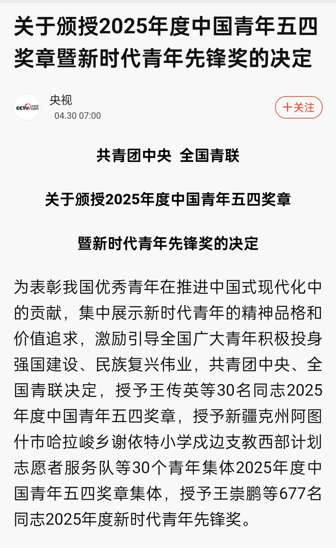 近日,共青团中央、全国青联发布了《关于颁授2025年度中国青年五四奖章暨新时代青年先锋奖的决定》,授予王传英等30名同志2025年度中国青年五四奖章,授予新疆克州阿图什市哈拉峻乡谢依特小学戍边支教西部计划志愿者服务队等30个青年集体2025年度中国青年五四奖章集体,授予王崇鹏等677名同志2025年度新时代青年先锋奖。其中,四川化工职业技术学院2名校友上榜,学校优秀校友洛古有格荣获2025年度中国青年五四奖章,学校优秀校友廖智全荣获2025年度新时代青年先锋奖!