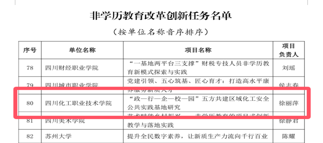 2月17日,教育部公示了2024年学习型社会建设重点任务(高等继续教育领域)培训建设名单,由学校党委委员、副院长徐丽萍负责的《“政-行-企-校-园”五方共建区域化工安全公共实践基地研究》项目成功入选“非学历教育改革创新任务”培育建设名单。这是我校继续教育领域首次入选国家级培育项目,是对学校长期以来坚持产教融合、服务地方经济发展的高度肯定!