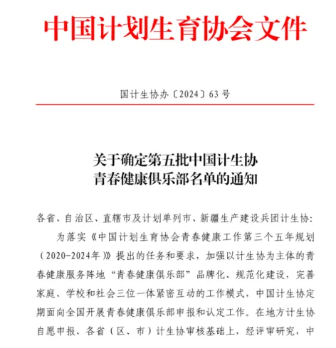 近日,中国计划生育协会公布了“第五批中国计生协青春健康俱乐部名单”,本次全国共确定青春健康俱乐部48家,我校成为本年度四川省唯一获此殊荣的院校。