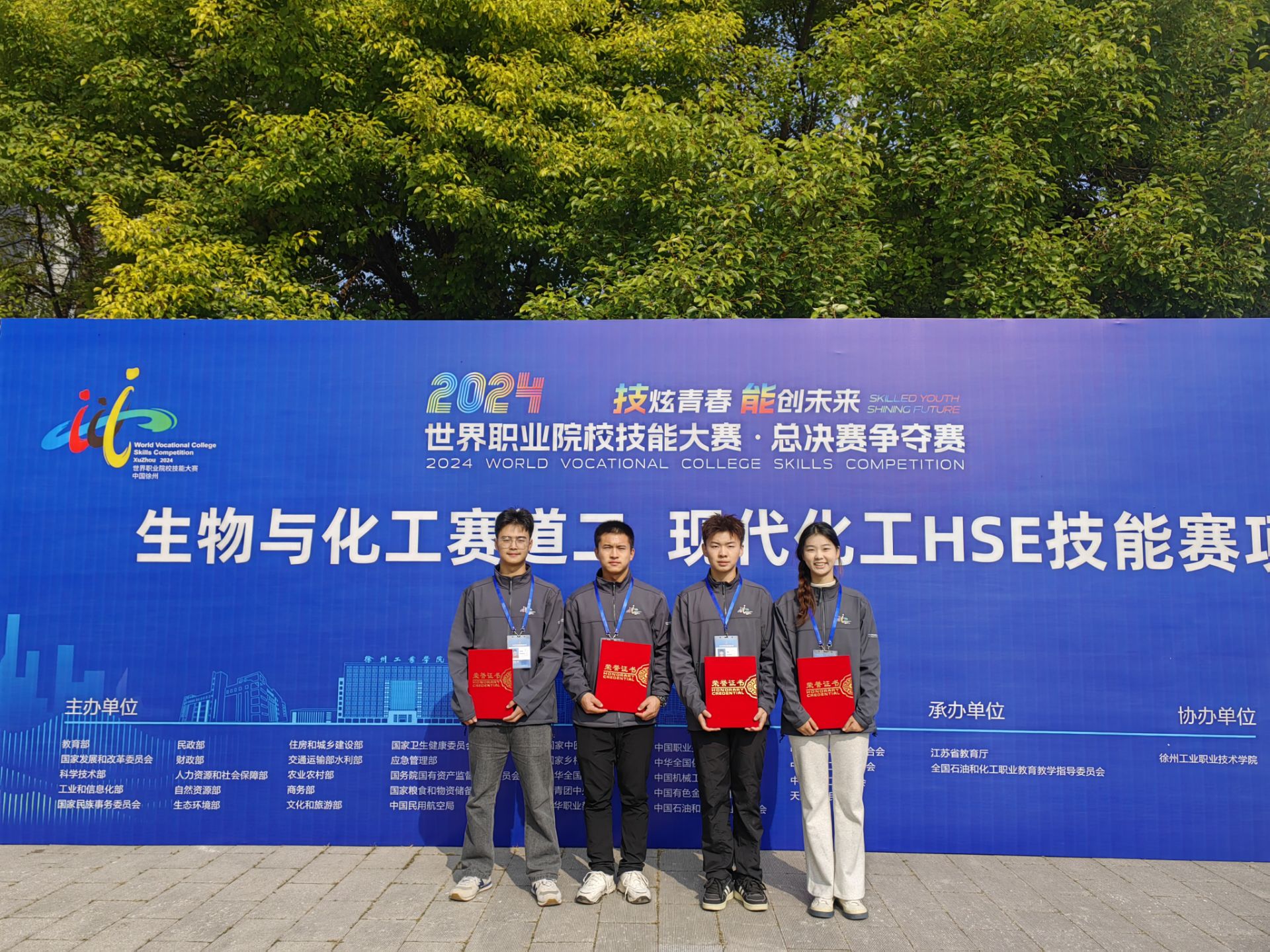 此次大赛,我校药品与环境工程学院蒋育虹、刘正宣、蒋超琦、贺鹏四名同学组成的代表队(指导教师:陈林、龙逢兴、朱先凤),在生物与化工赛道二组“现代化工HSE技能”赛项中,凭借精湛的专业技能、高效的团队协作以及稳定的现场表现,以总排名第二名的优异成绩荣获“金奖”。