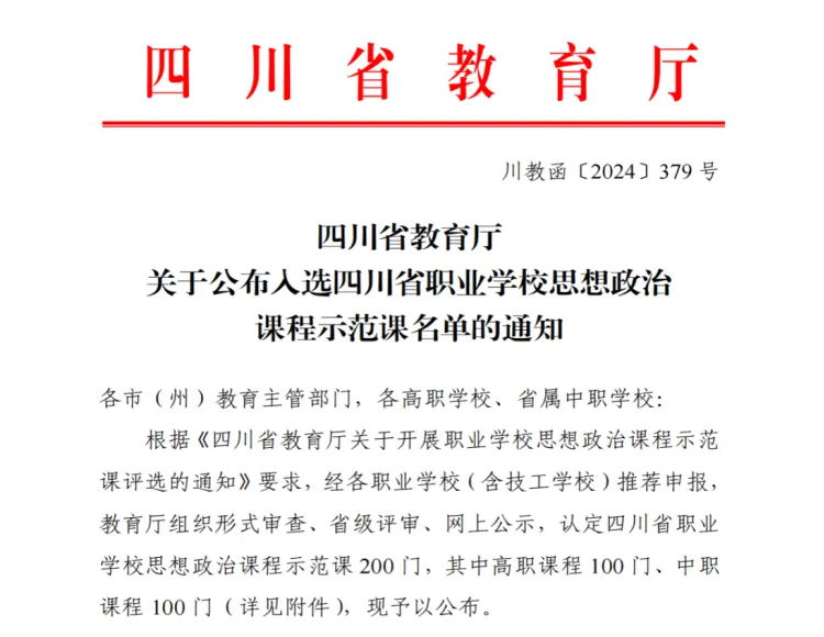 据了解,开展思想政治课程示范课认定工作,是四川省委教育工委、四川省教育厅全面推进新时代思政课建设、落实立德树人根本任务的具体举措,旨在持续深化职业学校思想政治课程改革实践,提高德育工作水平,推动我省职业学校思想政治教育教学取得新成效。