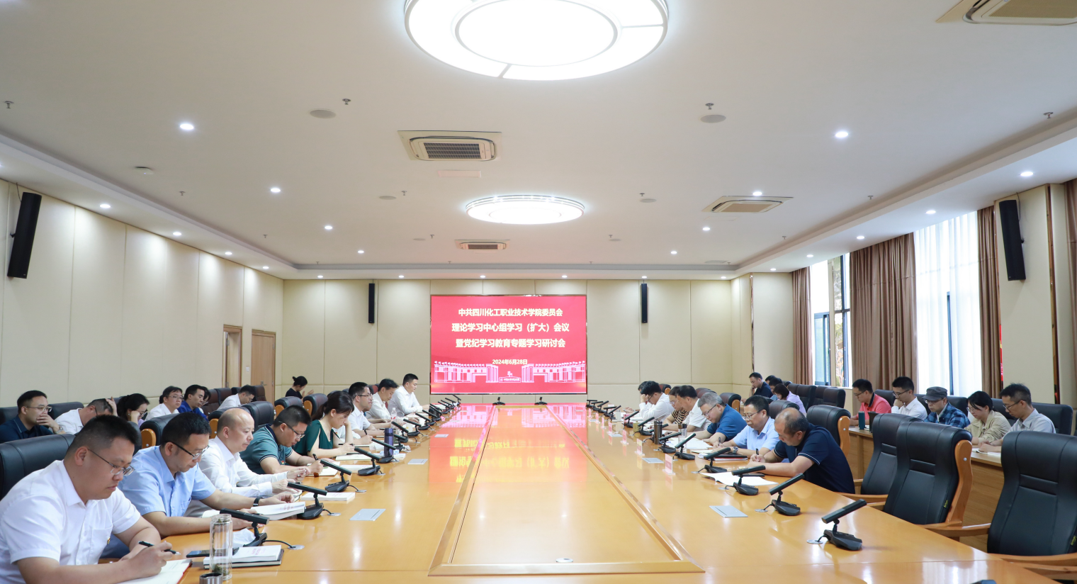 2024年6月28日,学校在综合办公楼第一会议室召开党委理论学习中心组学习(扩大)会议暨党纪学习教育专题学习研讨会,学校党委书记刘志勇主持会议并讲话。学校党委理论学习中心组成员、中层及以上领导干部参加会议。