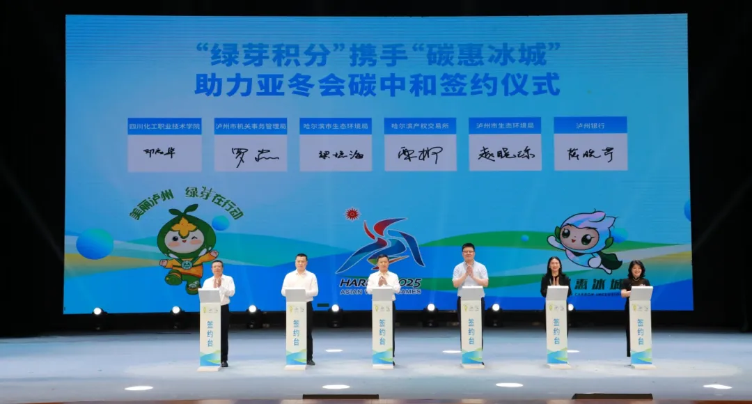 为推动打造跨区域碳普惠合作新样板,活动现场,泸州市碳普惠平台“绿芽积分”携手哈尔滨市碳普惠平台“碳惠冰城”助力亚冬会碳中和签约仪式举行。“碳惠冰城”主管部门哈尔滨市生态环境局、“碳惠冰城”运营单位哈尔滨产权交易所,泸州市机关单位代表泸州市机关事务管理局、泸州市生态环境局,泸州市高校代表四川化工职业技术学院,泸州市企业代表泸州银行共同上台签约。