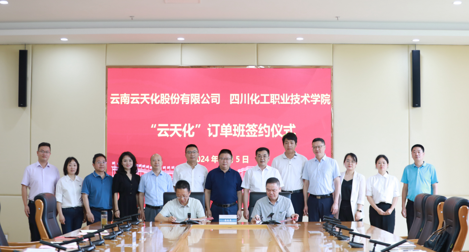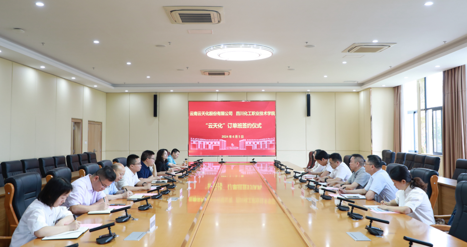 为进一步深化产教融合、校企合作,促进职业教育高质量发展,6月5日,云南云天化股份有限公司党委副书记、工会主席胡耀坤一行来校举行“云天化”订单班签约仪式。云南水富云天化有限公司党委书记、执行董事余雁冰,学校党委副书记、院长文申柳,党委委员、副院长蒲开伦参加签约仪式。仪式由学校党委委员、副院长谢光杰主持。