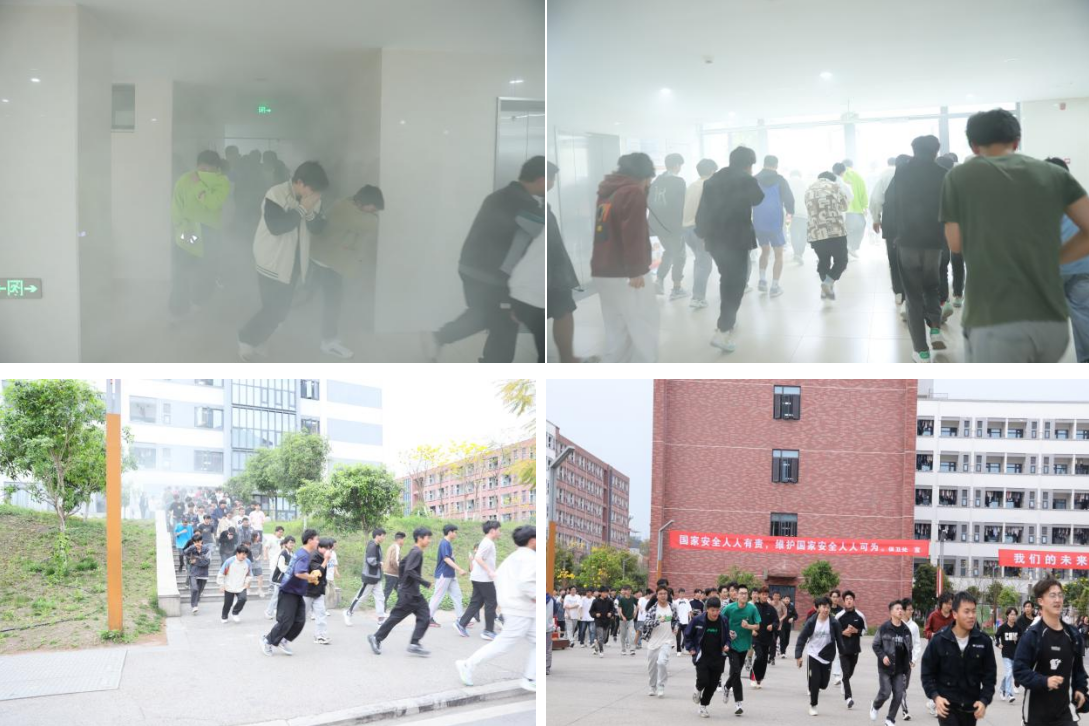 15时30分,演练总指挥谢光杰发出演练开始指令后,消防疏散警报、应急照明系统和应急广播系统立即启动,宿舍楼道内烟雾弥漫,消防演练正式开始。全体师生迅速进入紧急疏散状态,学生在疏散引导员的指引下,用湿毛巾、手帕等捂住口鼻,沿着逃生路线有序撤离火灾现场,安全到达疏散集合点。整个演练过程模拟了实战应急疏散流程,师生反应灵敏,撤离过程快而不乱、安全有序,能够很好地掌握突发事故来临时的注意事项和正确的逃生方法。