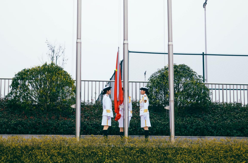 伴随着激情昂扬的《义勇军进行曲》,全体师生肃立,鲜艳的五星红旗冉冉升起。