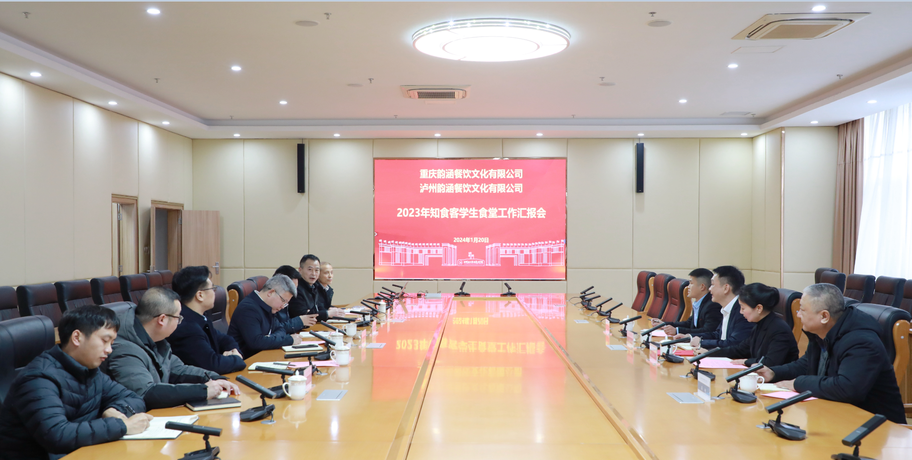 2024年1月20日下午,学校在护国校区综合办公楼107会议室召开托管知食客学生食堂2023年运营工作总结汇报会。重庆韵涵餐饮文化有限公司董事、泸州韵涵餐饮文化有限公司董事长吴传洪,重庆韵涵餐饮文化有限公司区域总监杜红梅,学校党委副书记、院长文申柳,副院长吴立凡参加会议。汇报会由副院长谢光杰主持。
