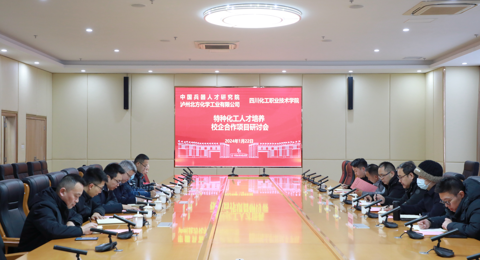 2024年1月22日下午,学校与中国兵器人才研究院、泸州北方化学工业有限公司在护国校区综合办公楼107会议室举行特种化工人才培养校企合作项目研讨会。中北大学环境与安全工程学院应急技术与管理专业负责人李保林教授,中国兵器人才研究院北方至信职业教育业务群业务总监牛振启,泸州北方化学工业有限公司总经理助理、人力资源部部长刘道勇,学校党委副书记、院长文申柳,党委委员、副院长邓启华参加会议。会议由学校党委委员、副院长谢光杰主持。
