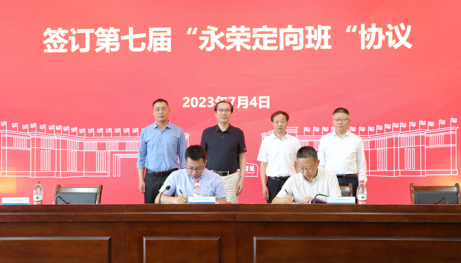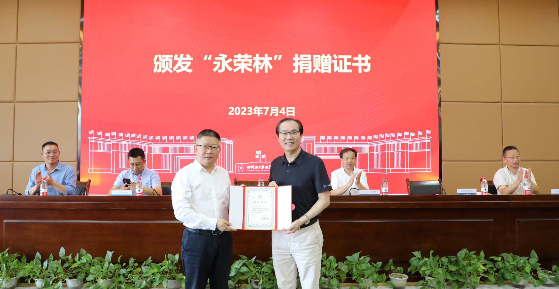 在与会人员的共同见证下,蒲开伦与杨微签订了第七届“永荣科技”校企合作协议,汪建根向文申柳颁发“校企战略合作伙伴”牌匾,文申柳向汪建根颁发“永荣林”捐赠证书。
