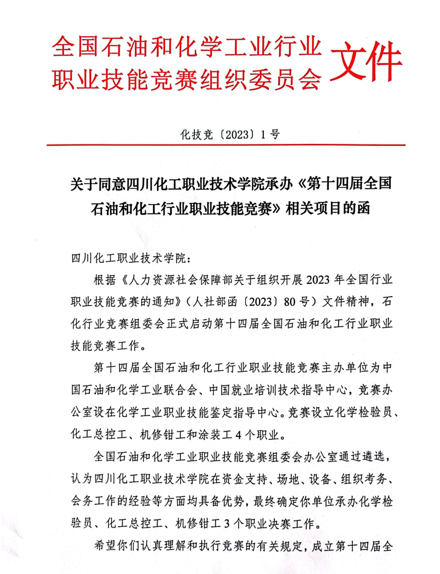 根据《人力资源社会保障部关于组织开展2023年全国行业职业技能竞赛的通知》(人社部函[2023]80号)文件精神,石化行业竞赛组委会正式启动第十四届全国石油和化工行业职业技能竞赛工作。第十四届全国石油和化工行业职业技能竞赛主办单位为中国石油和化学工业联合会、中国就业培训技术指导中心,竞赛办公室设在化学工业职业技能鉴定指导中心(简称鉴定指导中心)。竞赛设立化学检验员、化工总控工、机修钳工和涂装工4个职业。