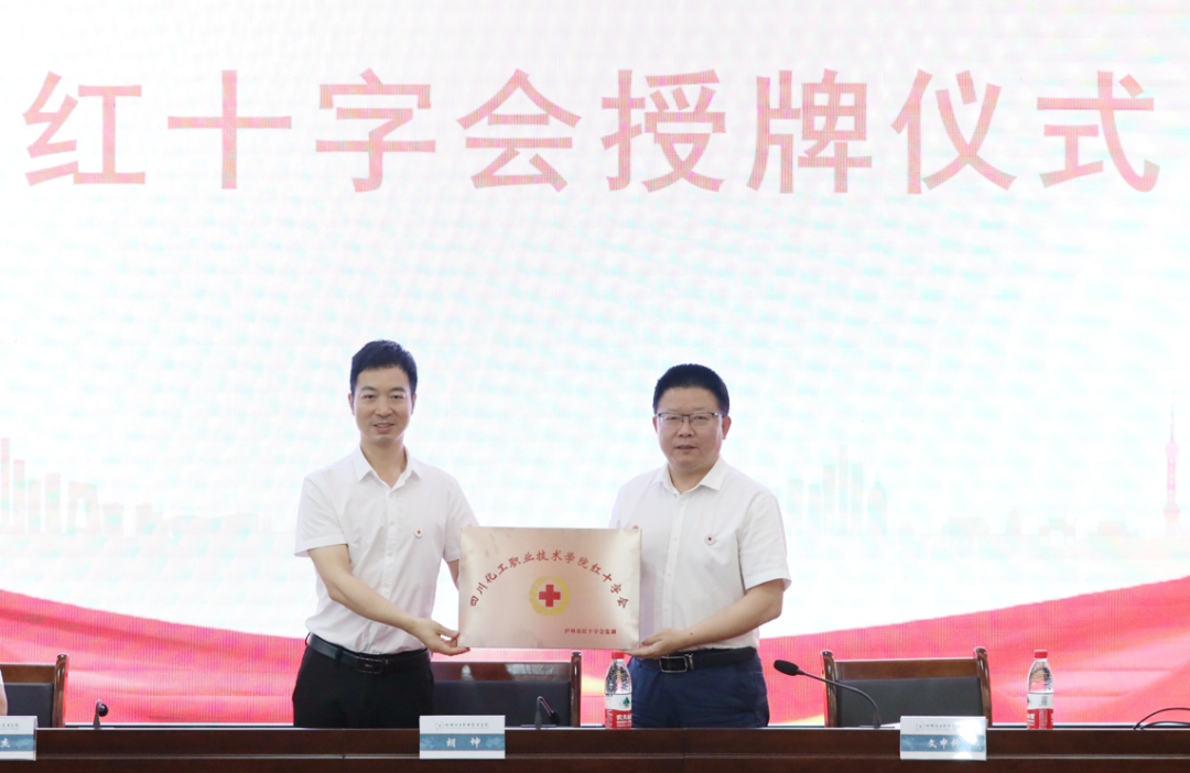会上,胡坤代表泸州市红十字会向学校授予“四川化工职业技术学院红十字会”牌匾,文申柳接受授牌。