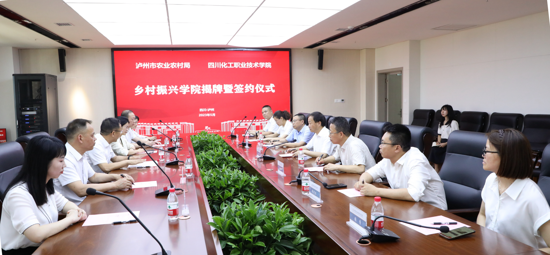 2023年5月17日,学校与市农业农村局合作共建的“乡村振兴学院”签约暨揭牌仪式在酒谷湖校区举行。市委农办主任、市农业农村局党组书记、局长陈廷俊,市农业农村局党组成员、副局长常敏,学校党委书记刘志勇,党委委员、副院长蒲开伦、邓启华参加仪式。仪式由学校党委委员、副院长谢光杰主持。