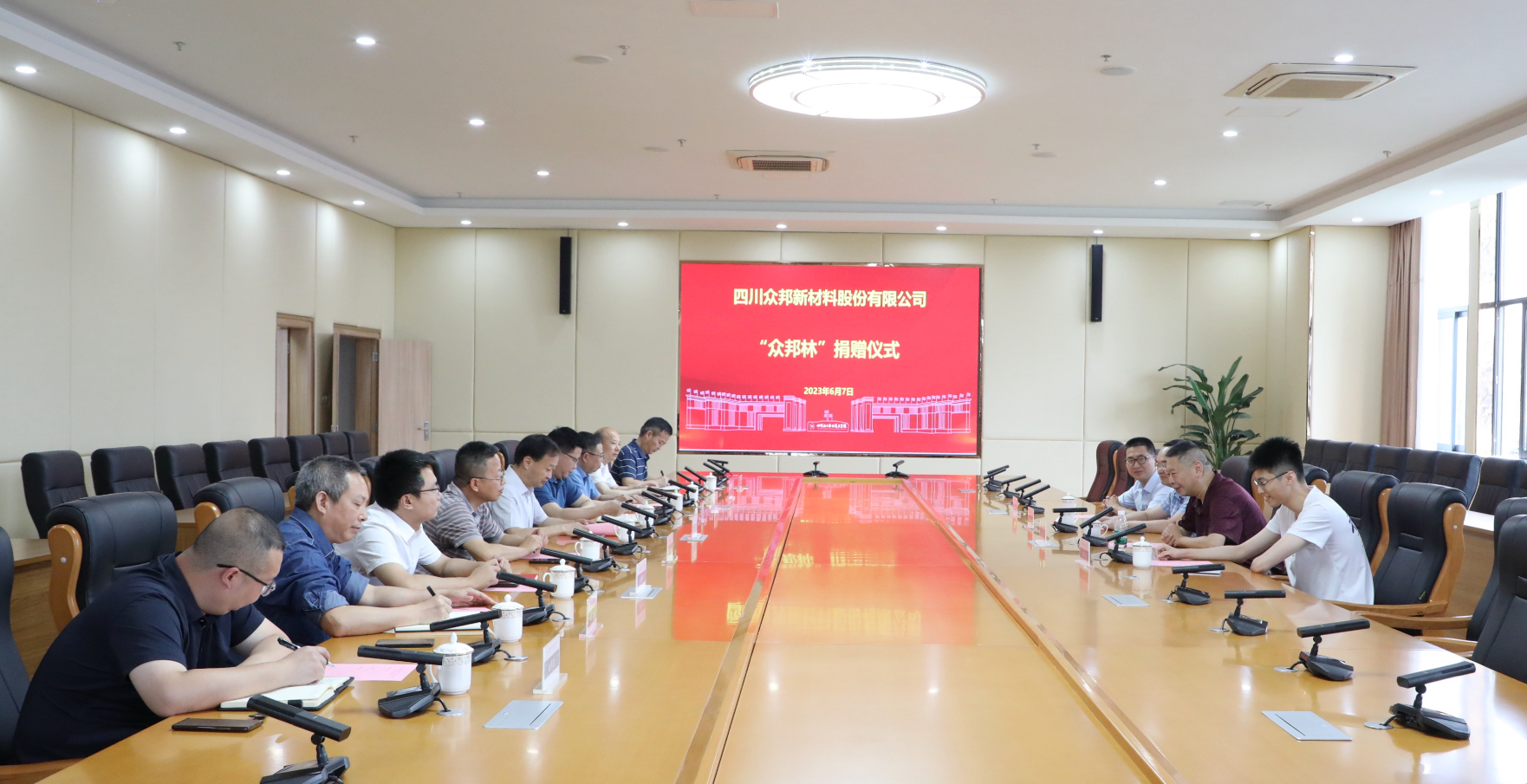 2023年6月7日上午,四川众邦新材料股份有限公司“众邦林”捐赠仪式在学校综合办公楼107会议室举行。四川众邦新材料股份有限公司董事长、总经理王军,副总经理、销售总监杜成,总经理助理王菁粟,学校党委书记刘志勇,党委副书记、院长文申柳,党委委员、副院长邓启华,谢光杰参加捐赠仪式。仪式由学校党委委员、副院长蒲开伦主持。
