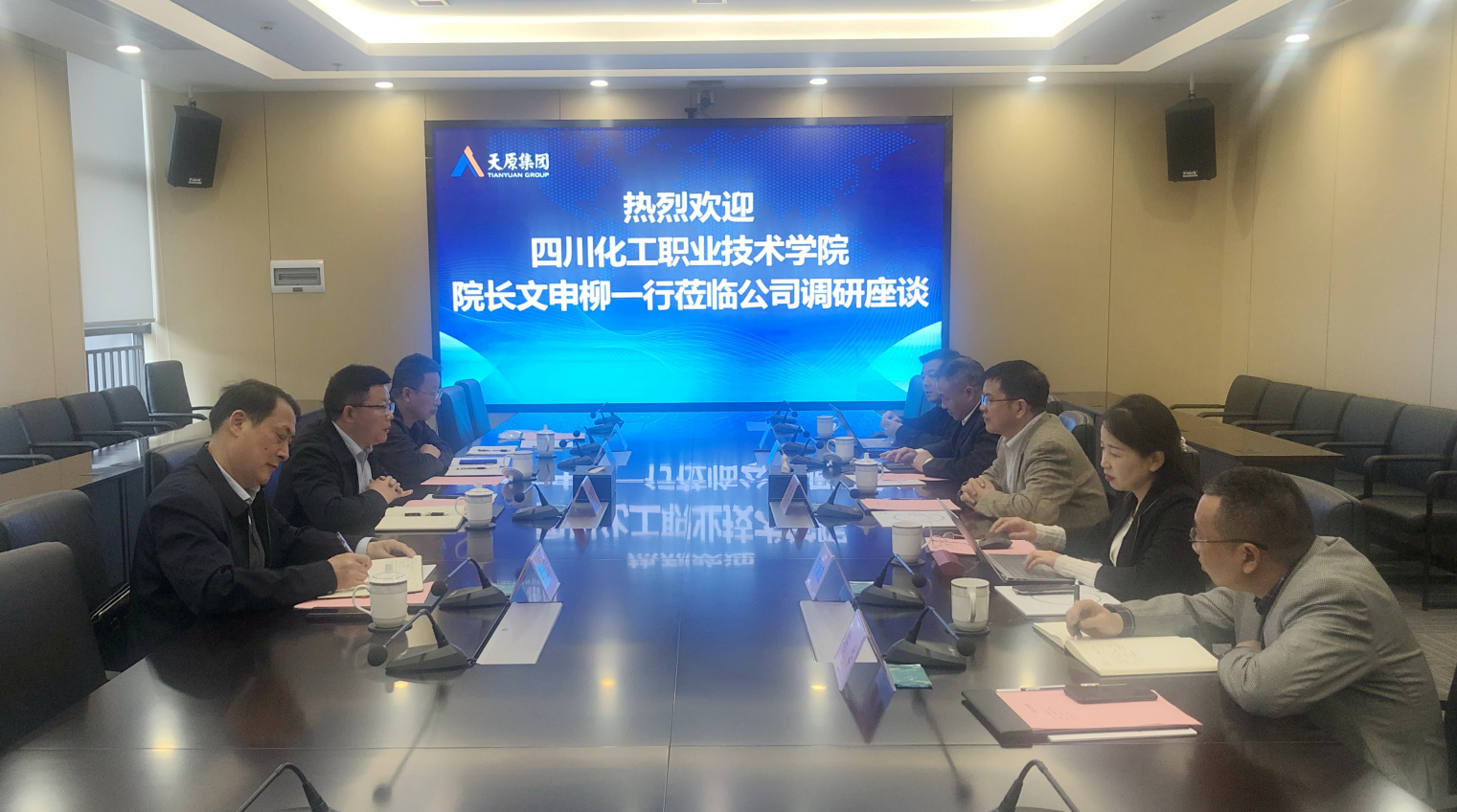 座谈会上,罗云对文申柳一行表示热烈欢迎,围绕公司发展历程、整体概况、新能源产业发展布局、项目政策帮扶等情况进行交流,并希望学校在人才支撑、化工产业等领域继续加强合作。文申柳祝贺天原集团近年来取得的可喜成绩,介绍了学校发展历程、办学规模及未来发展规划等情况,希望继续加强校企合作、访企拓岗方面的工作,在人才培养、员工技能培训、学生就业等方面开展更广泛的交流和合作。今年恰逢学校70周年校庆,文申柳诚挚邀请罗云董事长及其他优秀校友再回母校走一走、看一看,共续友情。双方还就宜宾校友联络处筹备工作达成了共识,将组建并正式挂牌宜宾校友联络处,吸引更多优秀校友入会,共谋发展。蒲开伦就加强员工培训、继续教育等工作展开了深入细致交流。