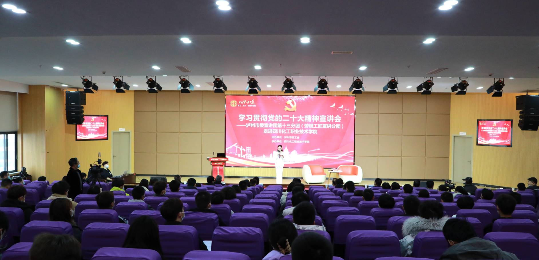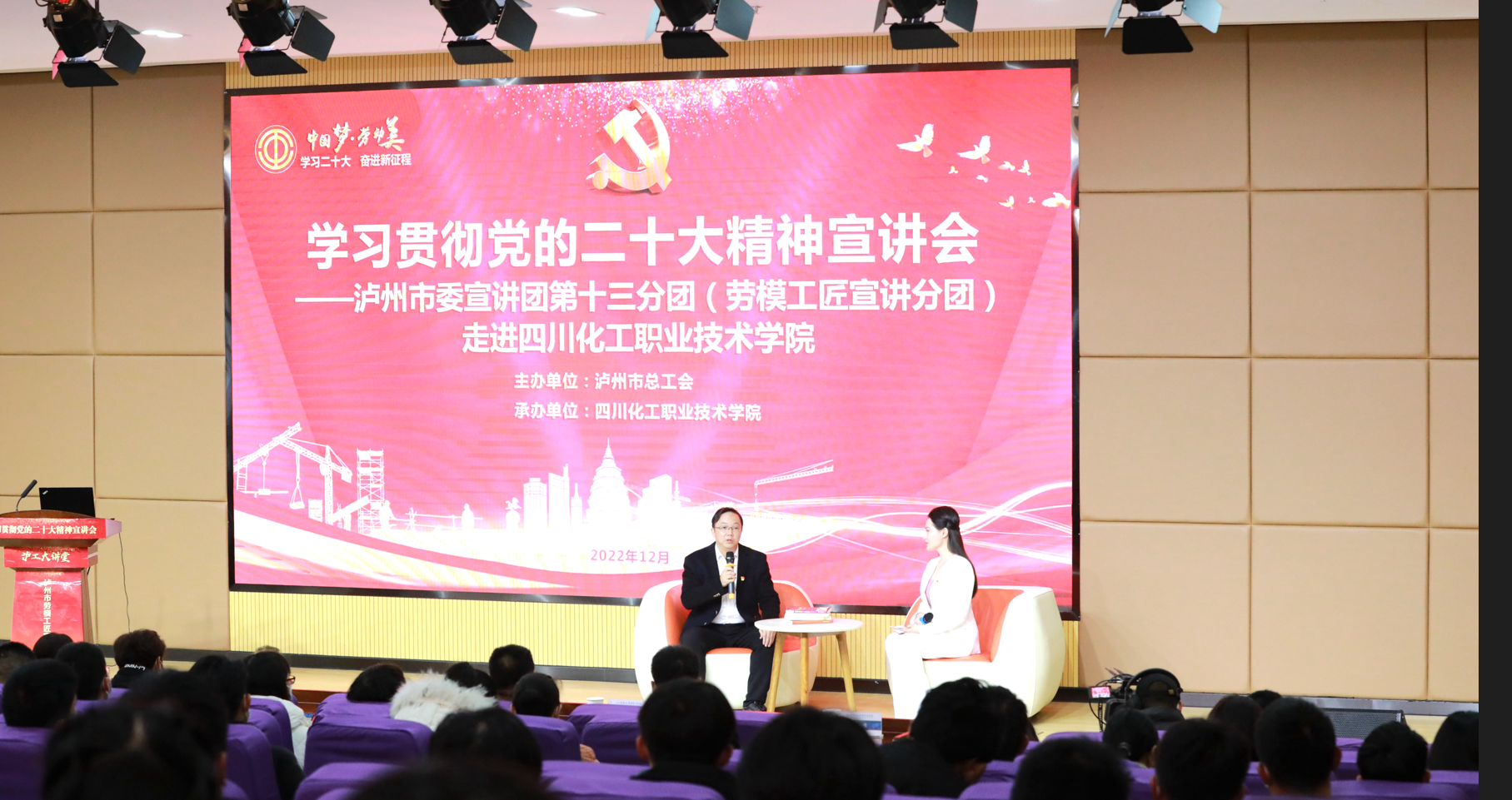 12月9日,由市总工会主办、四川化工职业技术学院承办的“中国梦•劳动美——学习二十大 奋进新征程”学习贯彻党的二十大精神宣讲会在学校图书馆四楼第二学术报告厅举行。市委宣讲团第十三分团(劳模工匠宣讲分团)走进学校,为广大师生讲授了一堂精彩生动的思政课。市总工会党组书记、常务副主席 刘瑶,市总工会党组成员、机关党委书记周正国,学校副院长谢光杰及200余名师生代表现场聆听了报告。
