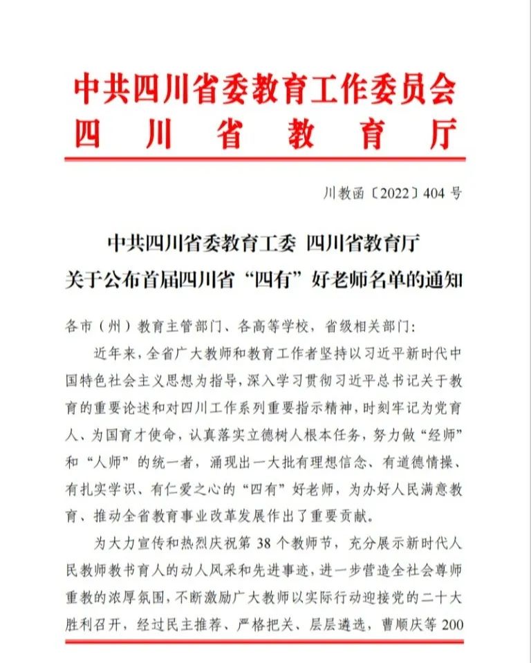近日,首届四川省“四有”好老师评选结果揭晓。经过民主推荐、严格把关、层层遴选,学校文仁兴副教授被省委教育工委、教育厅授予首届四川省“四有”好老师荣誉称号。