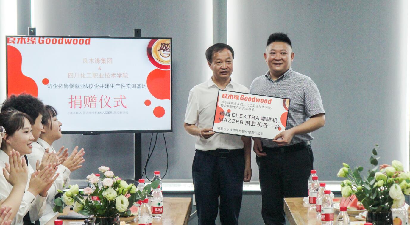 在“共建生产性实训基地”捐赠仪式上,刘志勇代表学校接受了良木缘集团捐赠价值约5万元的咖啡机设备一套,用于校内“良木缘”生产性实训基地建设。