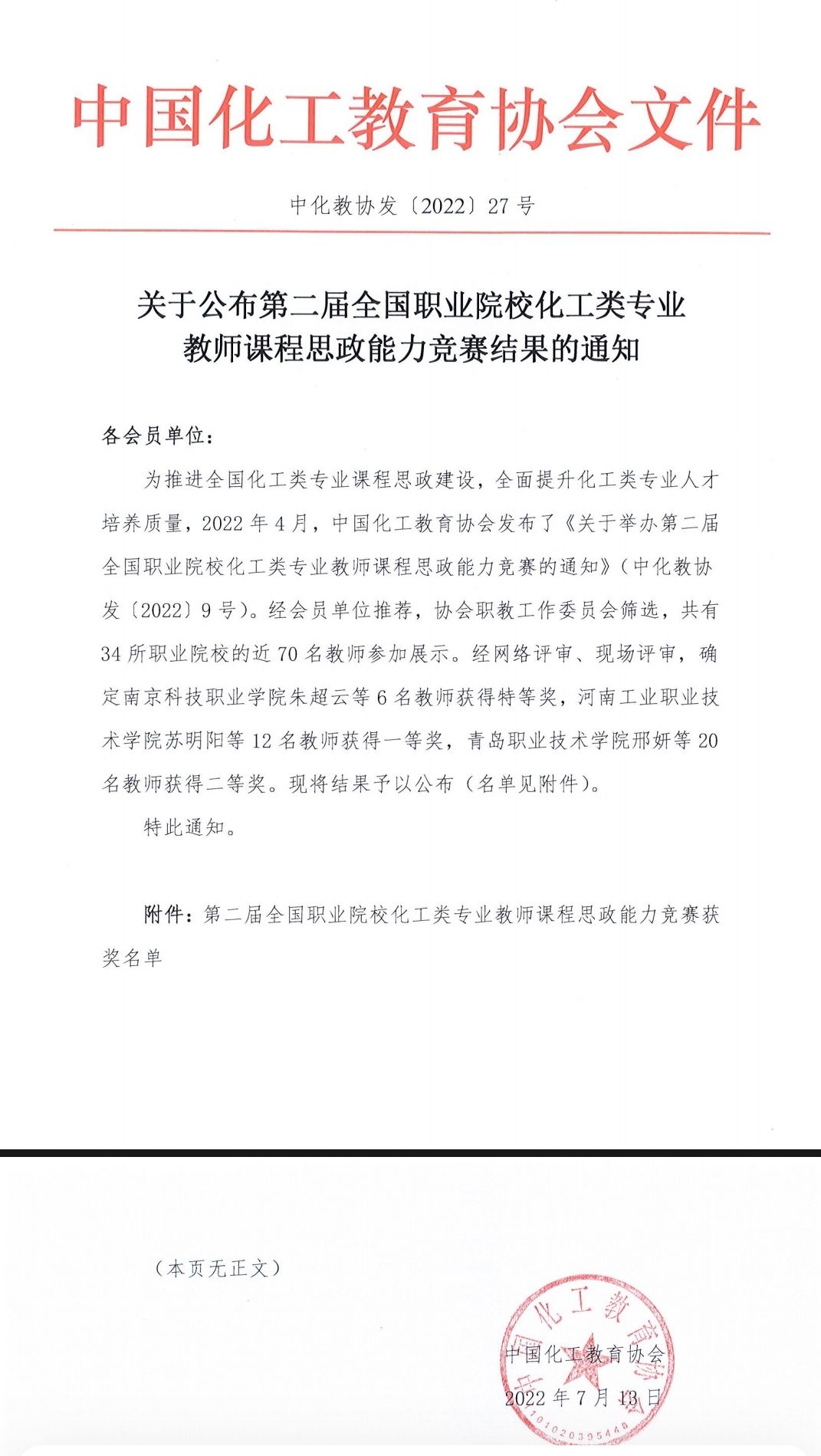 7月13日,中国化工教育协会公布了第二届全国职业院校化工类专业教师课程思政能力竞赛获奖名单,学校应用化工学院教师屈超荣获“特等奖”,药品与环境工程学院教师周玉娇荣获“一等奖”。