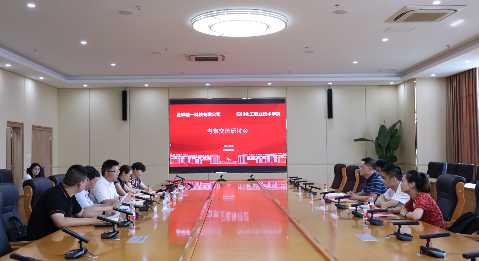 座谈会上,文申柳介绍了学校办学历史、办学特色、校园建设等相关情况,希望校企双方不断加强交流合作,深化校企合作,做细做精产教融合,实现资源共享,推动校企双方实现共赢。陈跃对学校取得的成就表示祝贺,并介绍了公司发展概况、运营模式等,希望共同探讨和创新“1+1+N”的协同育人模式,推动校企合作向纵深发展。与会人员还就产教融合情况、实训基地建设、专业特色建设、就业等相关内容进行了深入交流和讨论。