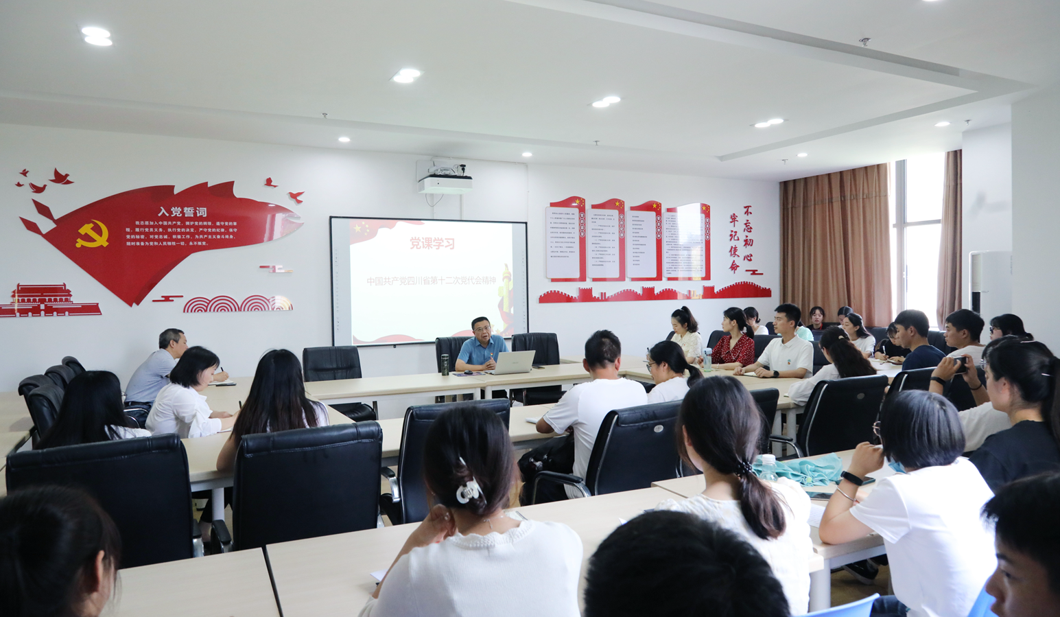 2022年6月15日下午,学校副院长邓启华在综合办公楼230室为药品与环境工程学院党总支上党课,学习传达四川省第十二次党代会精神。药品与环境工程学院党总支全体教师党员、学生预备党员参加学习会。