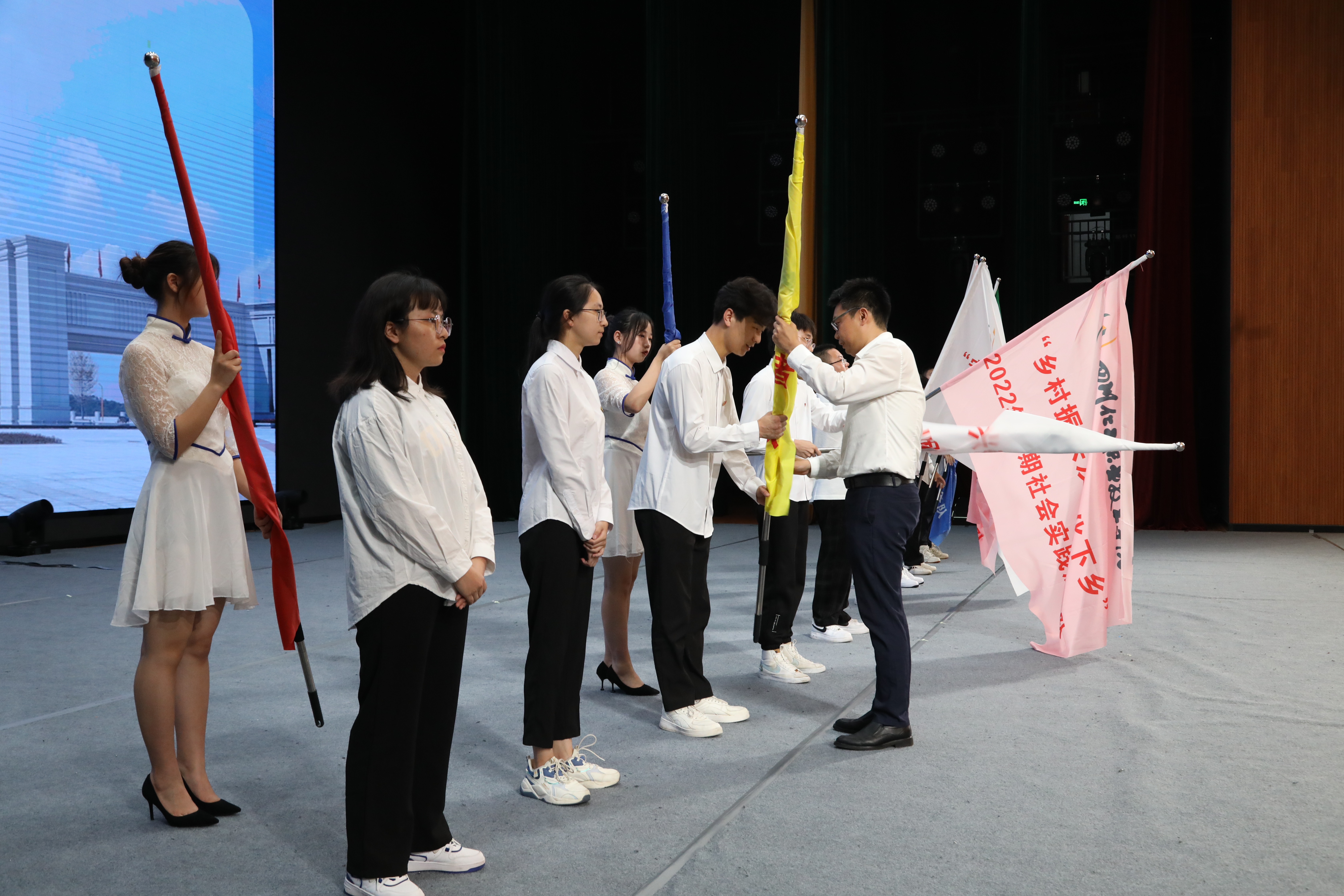 最后,谢光杰向即将出征的实践团队领队同学授予实践队旗。至此,学校2022年学生暑期社会实践活动全面展开。