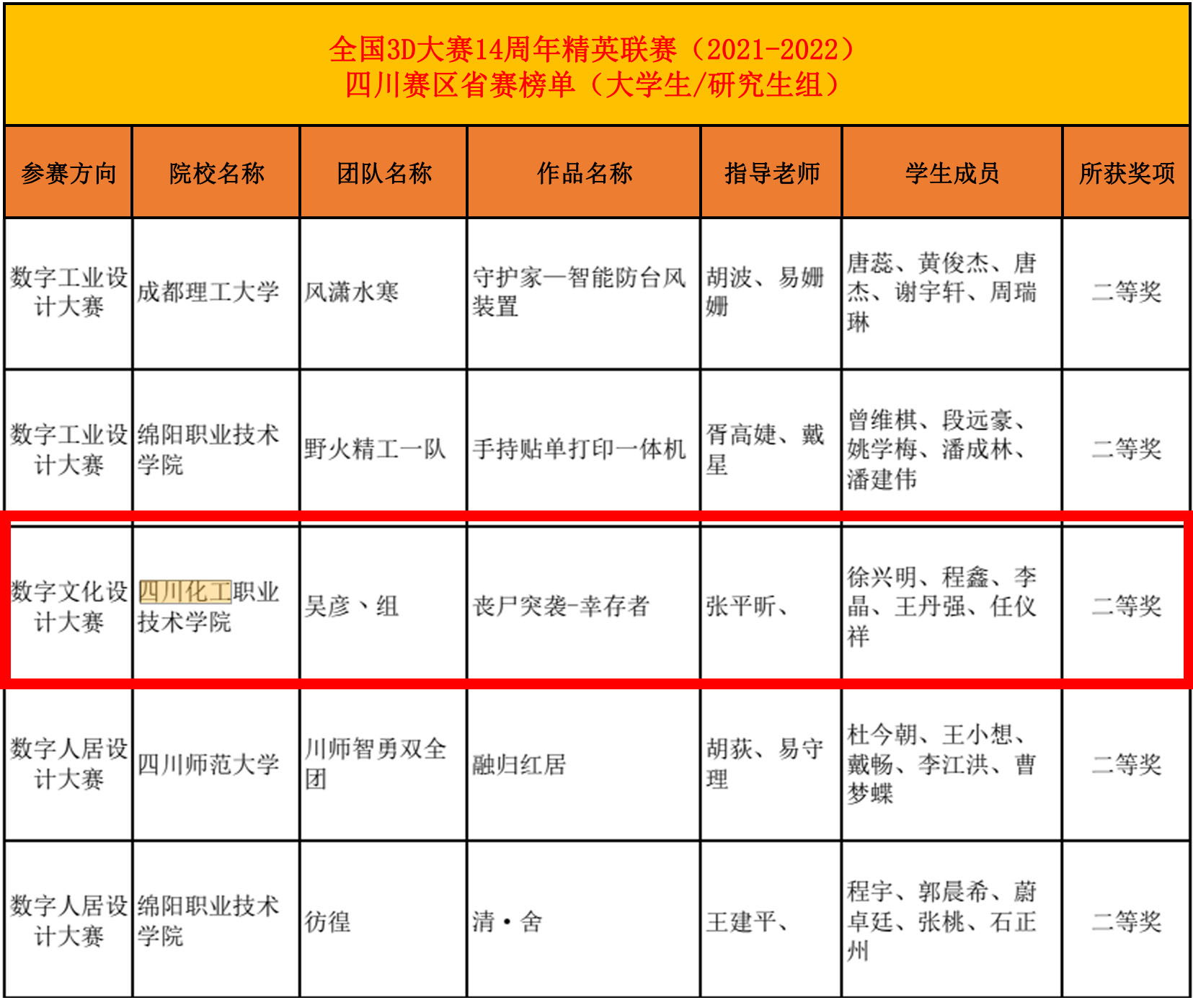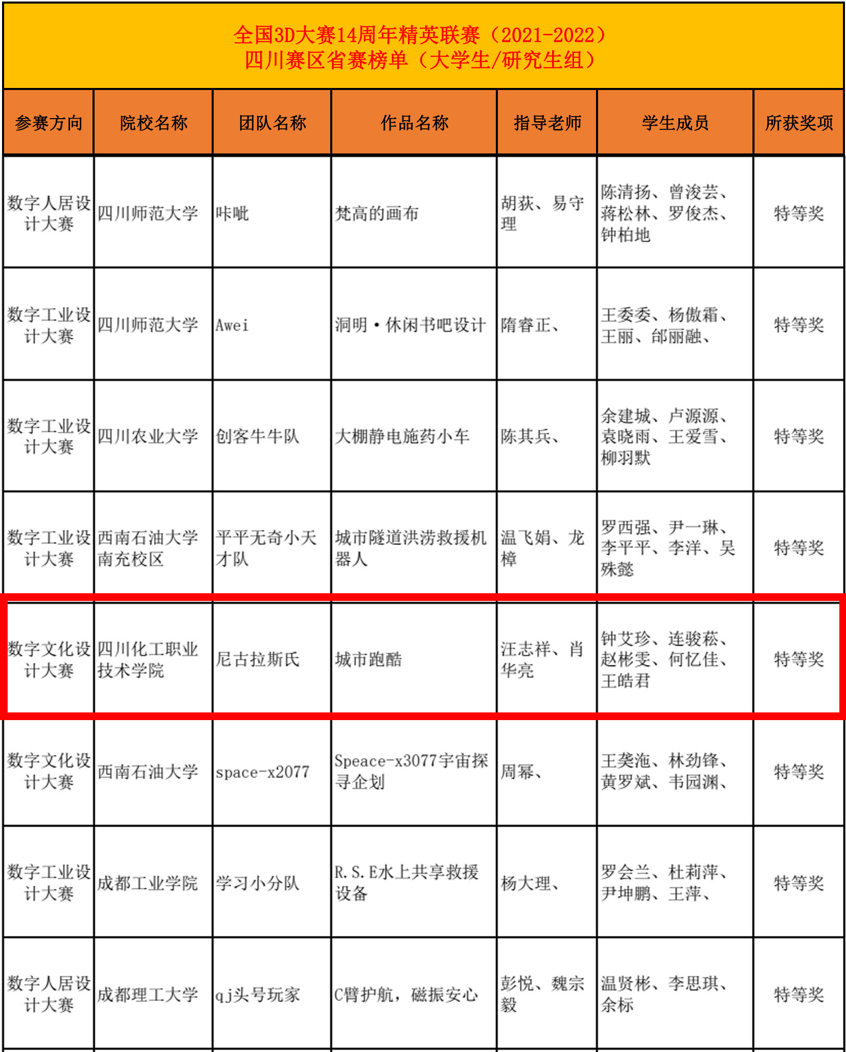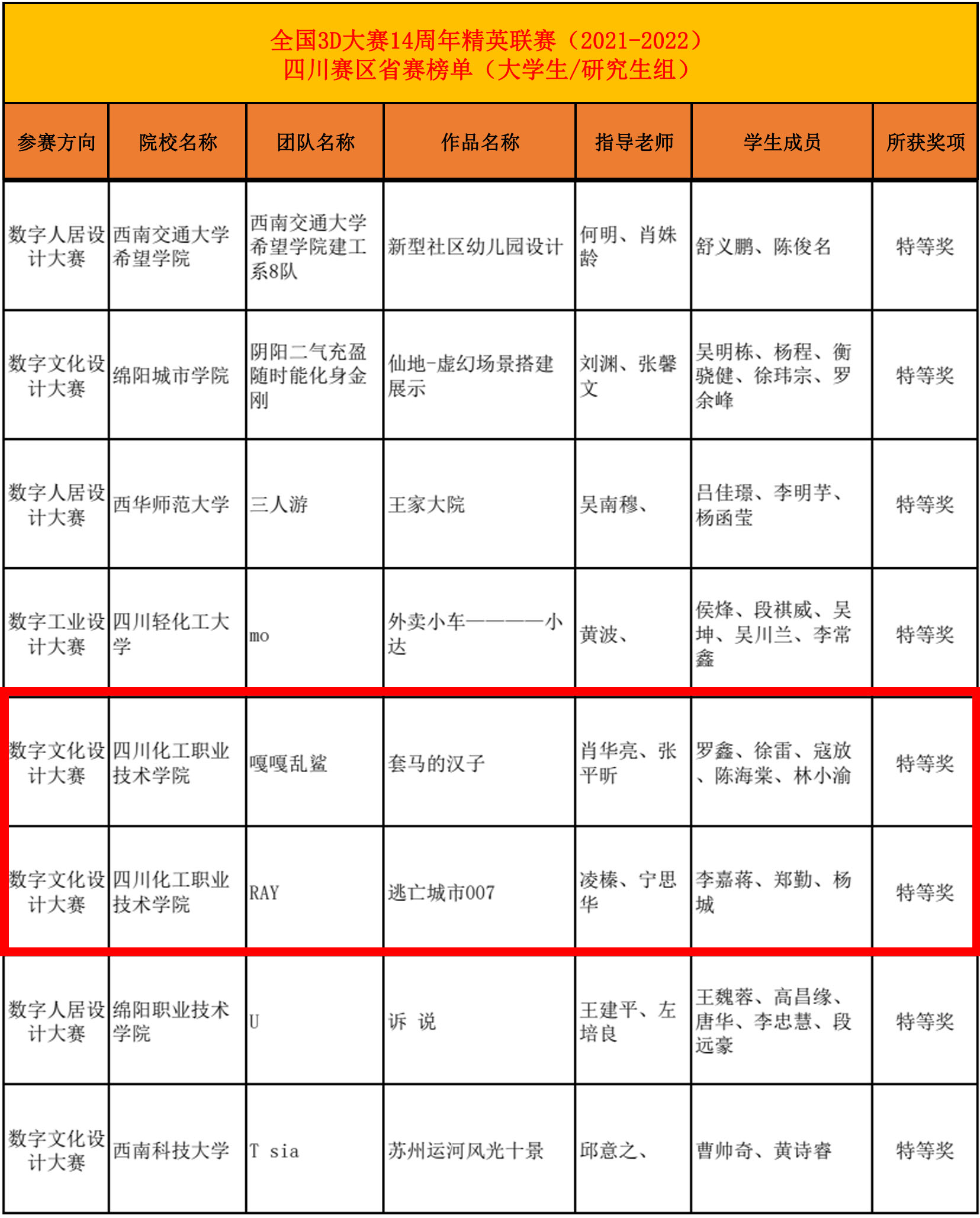 “嘎嘎乱鲨”团队(由学生罗鑫、徐雷、寇放、陈海棠、林小渝组成)的作品《套马的汉子》、“RAY”团队(由学生李嘉蒋、郑勤、杨城组成)的作品《逃亡城市007》和“尼古拉斯氏”团队(由学生钟艾珍、连骏菘、赵彬雯、何忆佳、王皓君组成)的作品《城市跑酷》在全国三维数字化创新设计大赛14周年精英联赛(2021-2022)四川赛区大学生/研究生组荣获特等奖,“吴彦·组”团队(由学生徐兴明、程鑫、李晶、王丹强、任仪祥组成)的作品《丧尸突袭—幸存者》荣获二等奖。