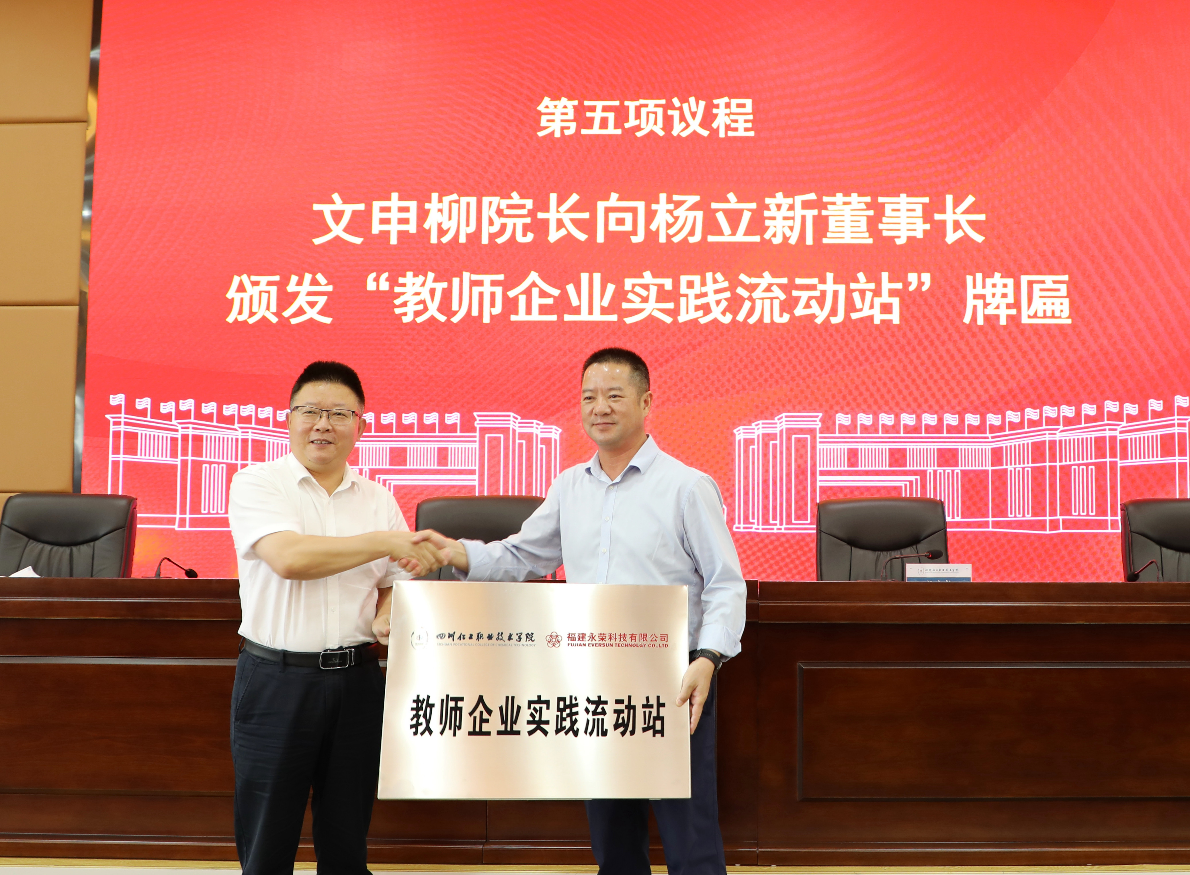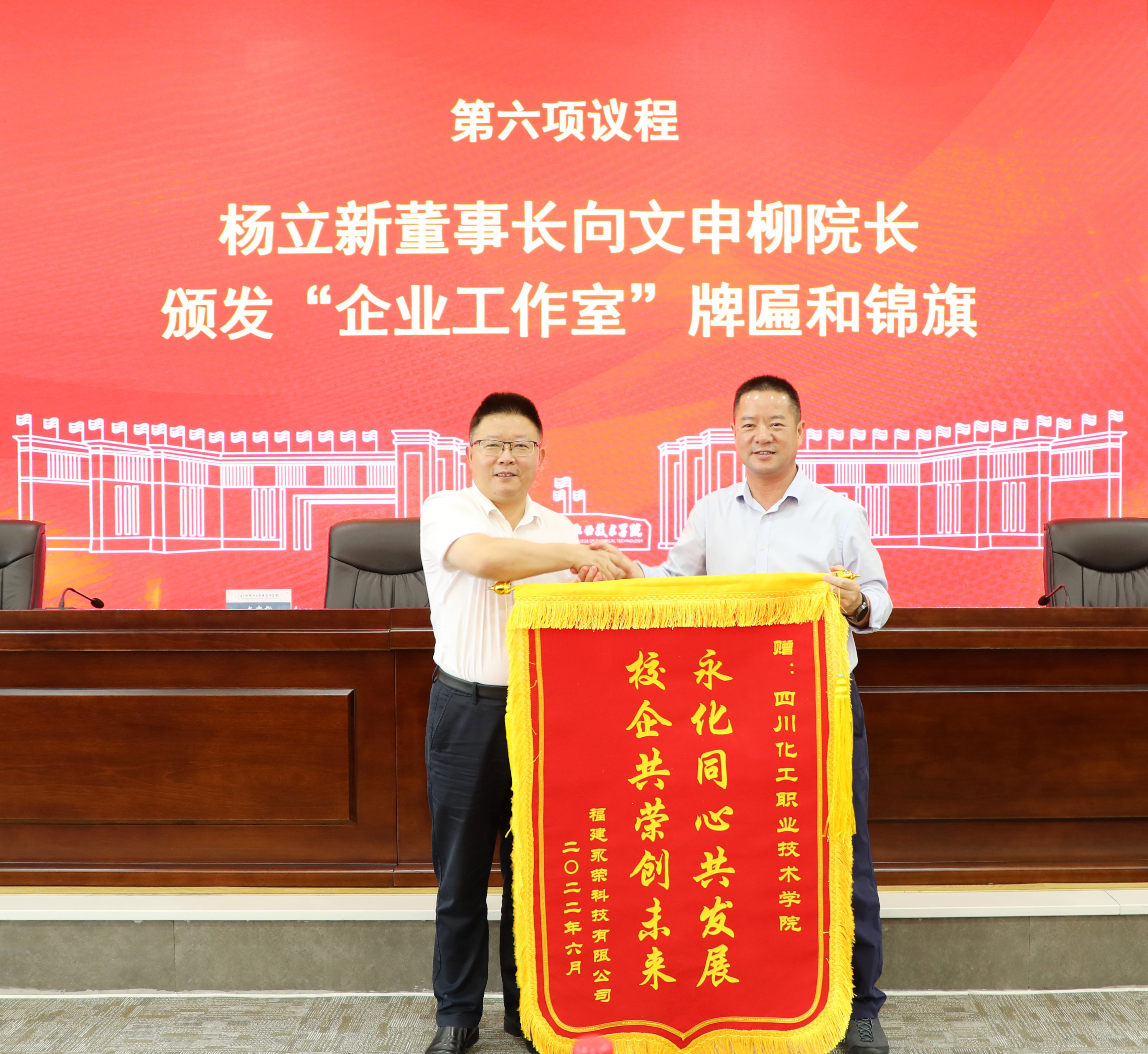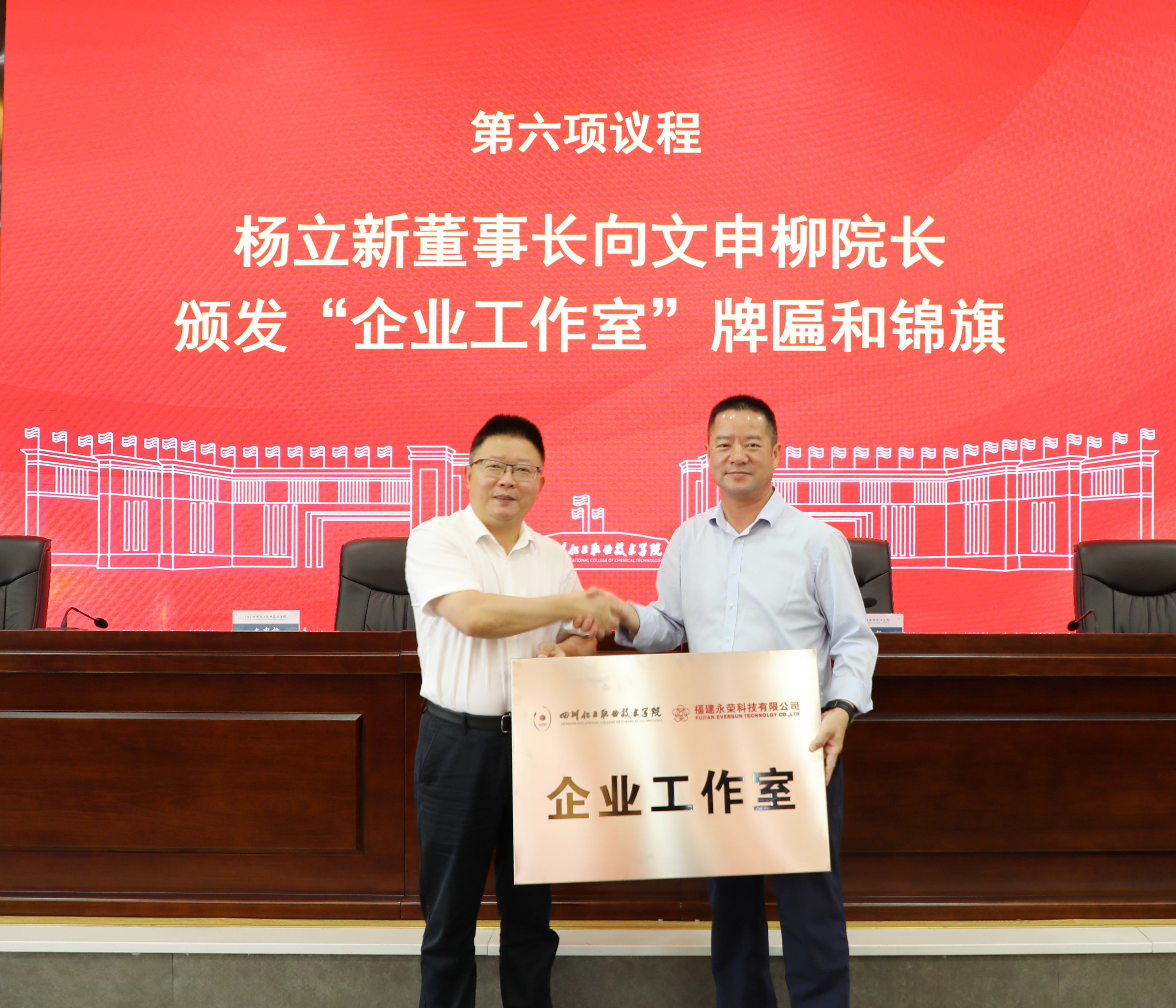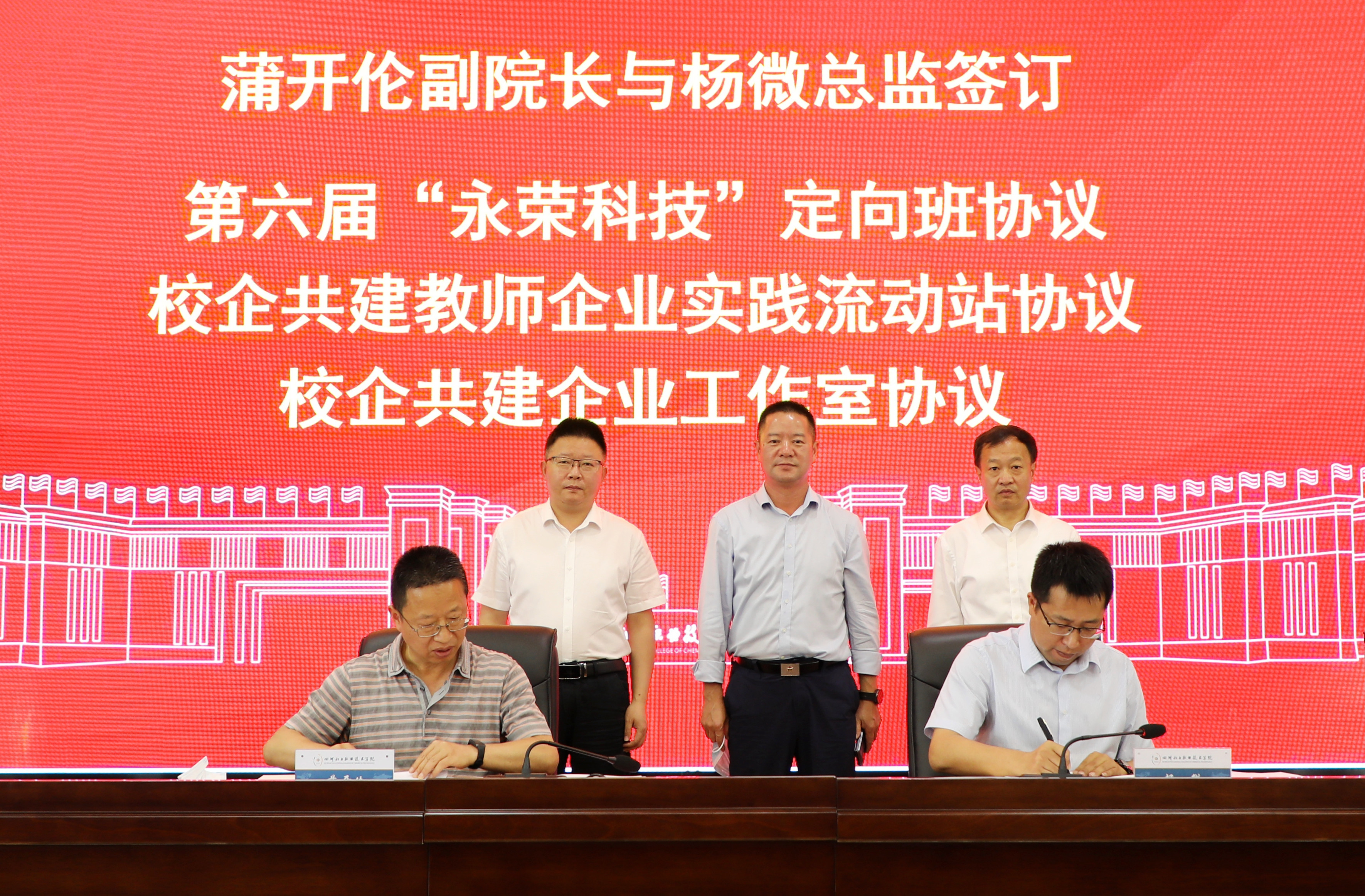 在与会人员的共同见证下,蒲开伦与杨微签订了第六届“永荣科技”校企合作协议、校企共建教师企业实践流动站协议和校企共建企业工作室协议。