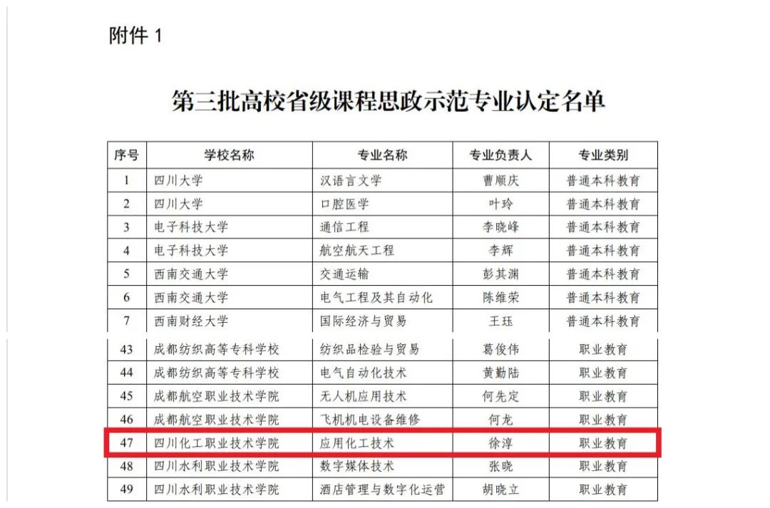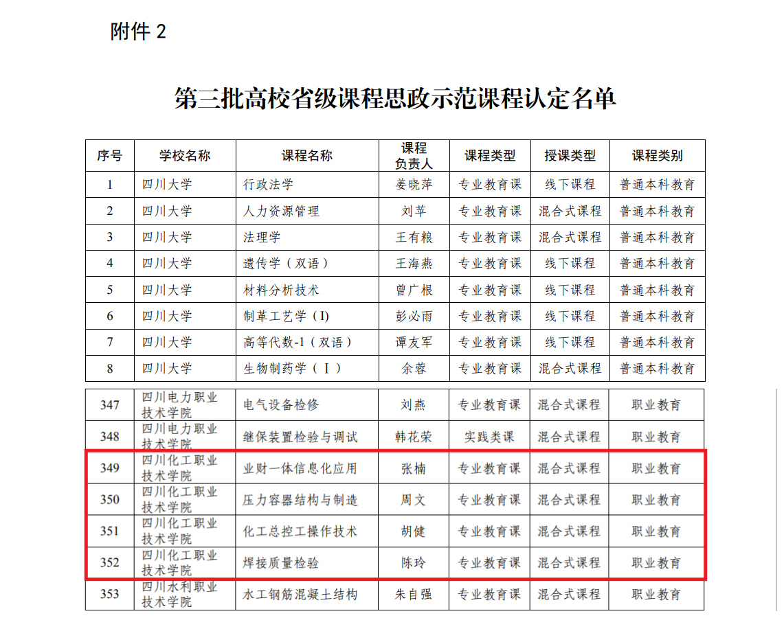 近日,四川省教育厅公示了第三批高等学校省级课程思政示范项目的认定结果。学校“应用化工技术”专业被认定为省级“课程思政”示范专业;学校“应用化工技术课程群教学团队”“业财税管课程群教学团队”被认定为省级课程思政示范教学团队;学校《业财一体信息化应用》《压力容器结构与制造》《化工总控工操作技术》《焊接质量检验》课程被认定为省级“课程思政”示范课程。