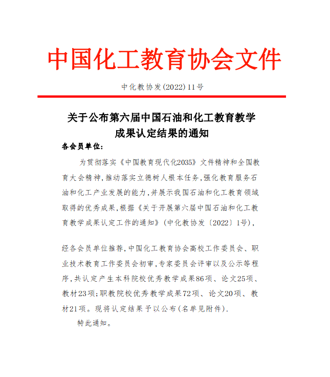 第六届中国石油和化工教育教学优秀成果认定是为贯彻落实《中国教育现代化2035》文件精神和全国教育大会精神,推动落实立德树人根本任务,强化教育服务石油和化工产业发展的能力,并展示我国石油和化工教育领域取得的优秀成果。此次中国石油和化工教育教学成果评选共认定产生职教院校优秀教学成果72项、论文20项、教材21项。本次教学成果奖的取得,是学校坚持“党建引领 以质图强 特色立校”的办学定位,聚焦专业建设、师资队伍、人才培养、校企合作、产教融合、对外服务等方面,坚持育人为本、德育为先,落实育训结合、德技并修,深化专业集群改革,完善产教融合模式,构建技术创新体系,深化改革赋能增效,推进学校“双高”建设、提质培优、“对标竞进、争创一流”的创造性成果,为学校进一步发挥特色优势、培育更高层次教育教学成果奠定了良好基础。