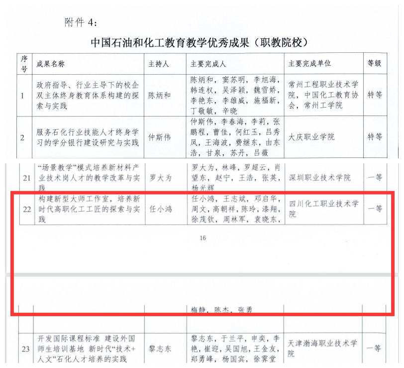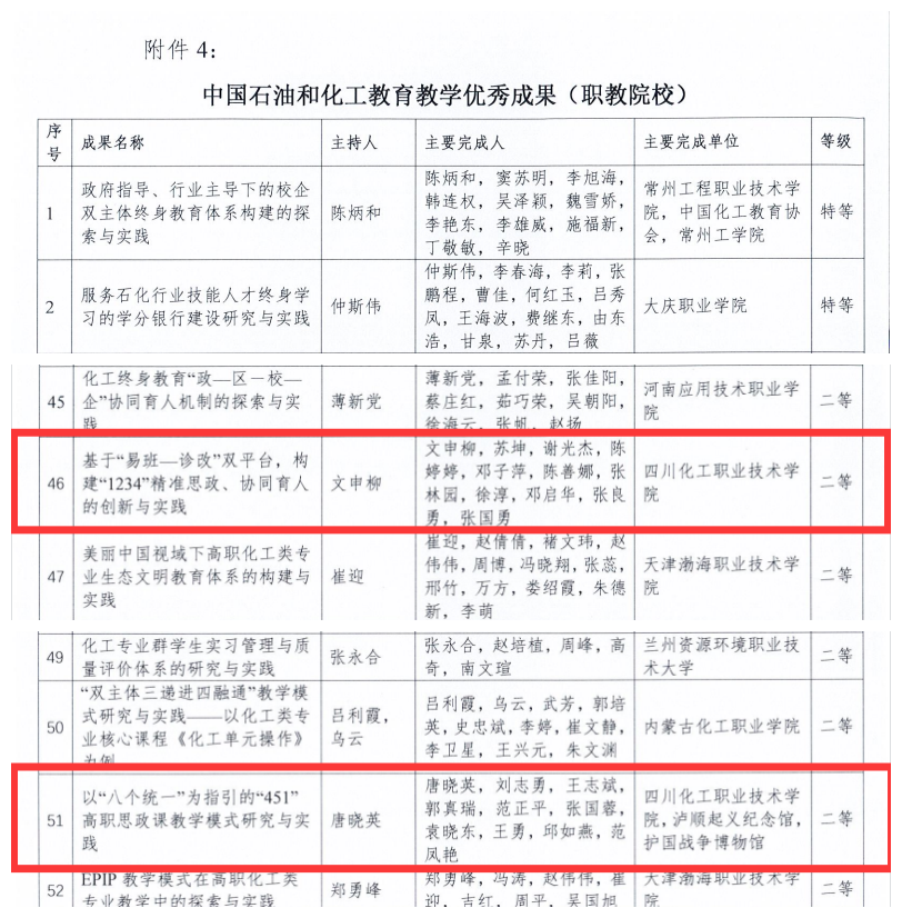 近日,中国化工教育协会公布了第六届中国石油和化工教育教学成果的评选结果,由机械工程学院党总支副书记、院长任小鸿主持的“构建新型大师工作室,培养新时代高职化工工匠的探索与实践”荣获第六届中国石油和化工教育教学优秀成果“一等奖”;由学校党委副书记、院长文申柳主持的“基于‘易班——诊改’双平台,构建‘1234’精准思政、协同育人的创新与实践”、由马克思主义学院教授唐晓英主持的“以‘八个统一’为指引的‘451’高职思政课教学模式研究与实践”荣获第六届中国石油和化工教育教学优秀成果“二等奖”;由党委书记刘志勇撰写的《以高质量党建引领职业院校高质量发展》论文荣获第六届中国石油和化工教育教学优秀论文“二等奖”。
