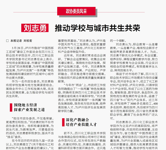 4月14日,泸州日报优秀政协委员风采系列报道以《刘志勇:推动学校与城市共生共荣》为题,报道了学校党委书记、市政协委员刘志勇始终围绕全市中心工作,关注民生民情民意,全力推动学校与城市共生共荣。