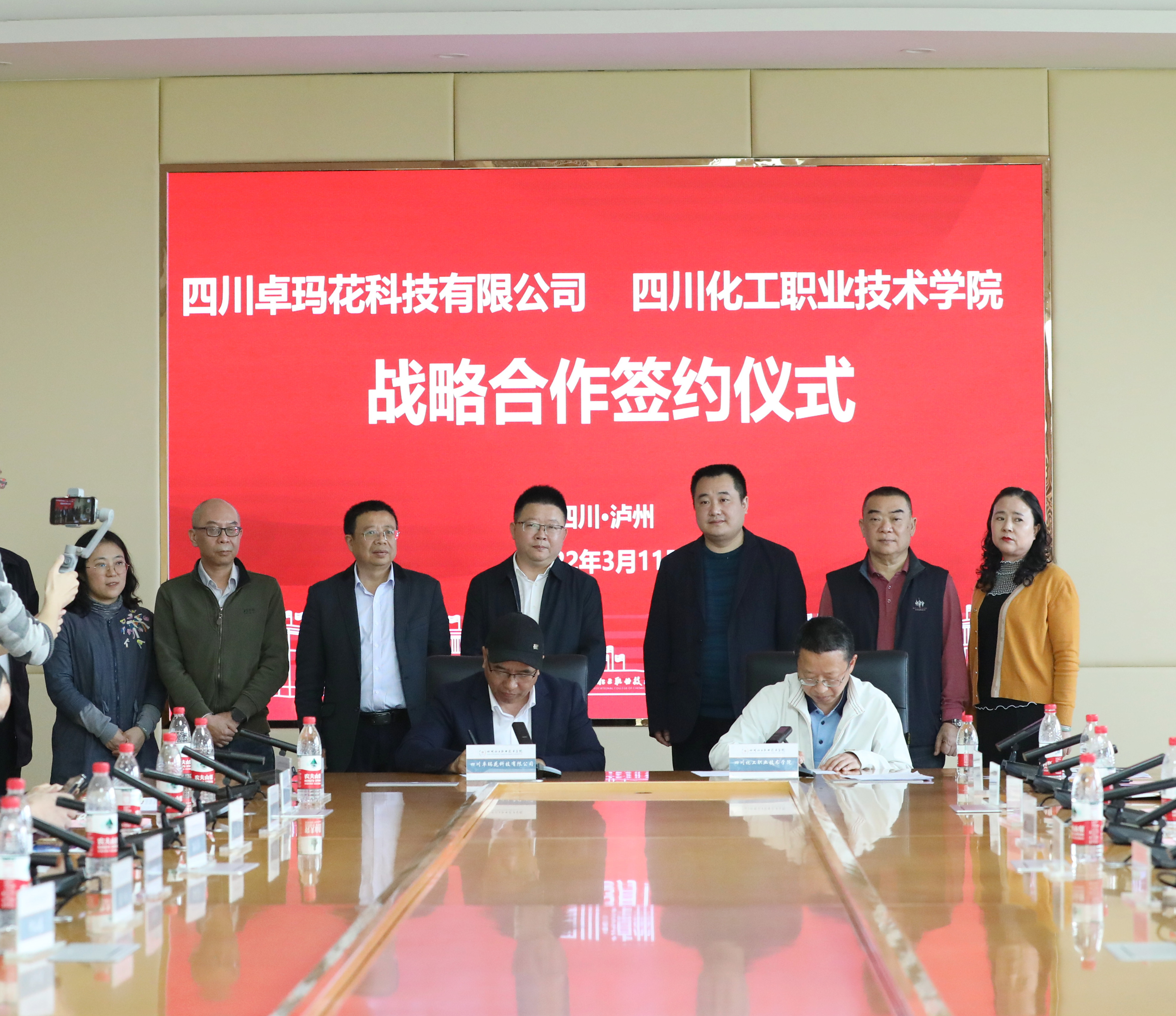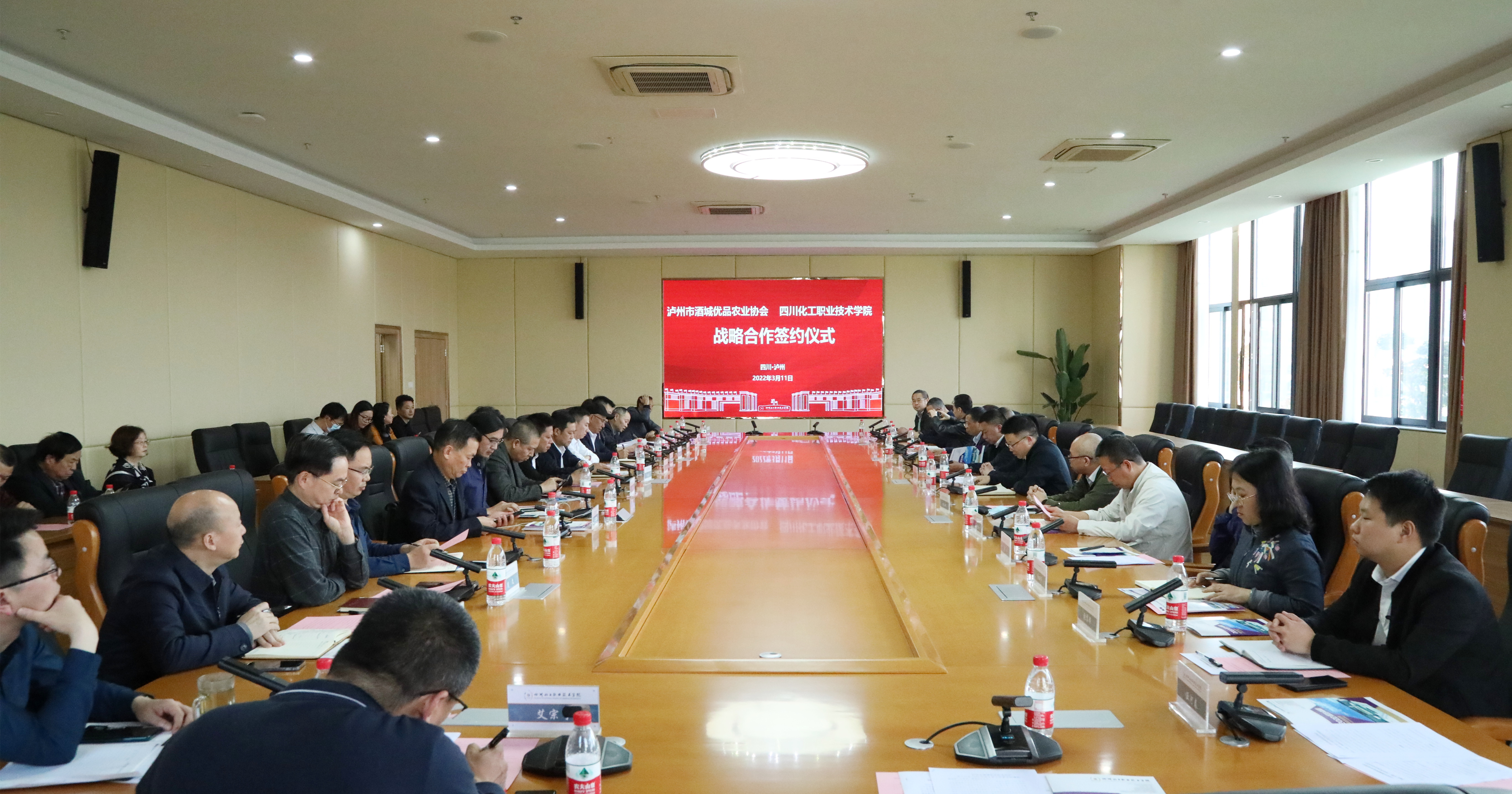 3月11日,学校与市酒城优品农业协会及协会会员单位四川卓玛花科技有限公司、泸州古泉洞酒业有限公司战略合作签约仪式在综合办公楼第一会议室举行。市农业农村局总经济师江维兵、市酒城优品农业协会会长苏懿,学校党委副书记、院长文申柳,副院长蒲开伦参加签约仪式。签约仪式由副院长邓启华主持。