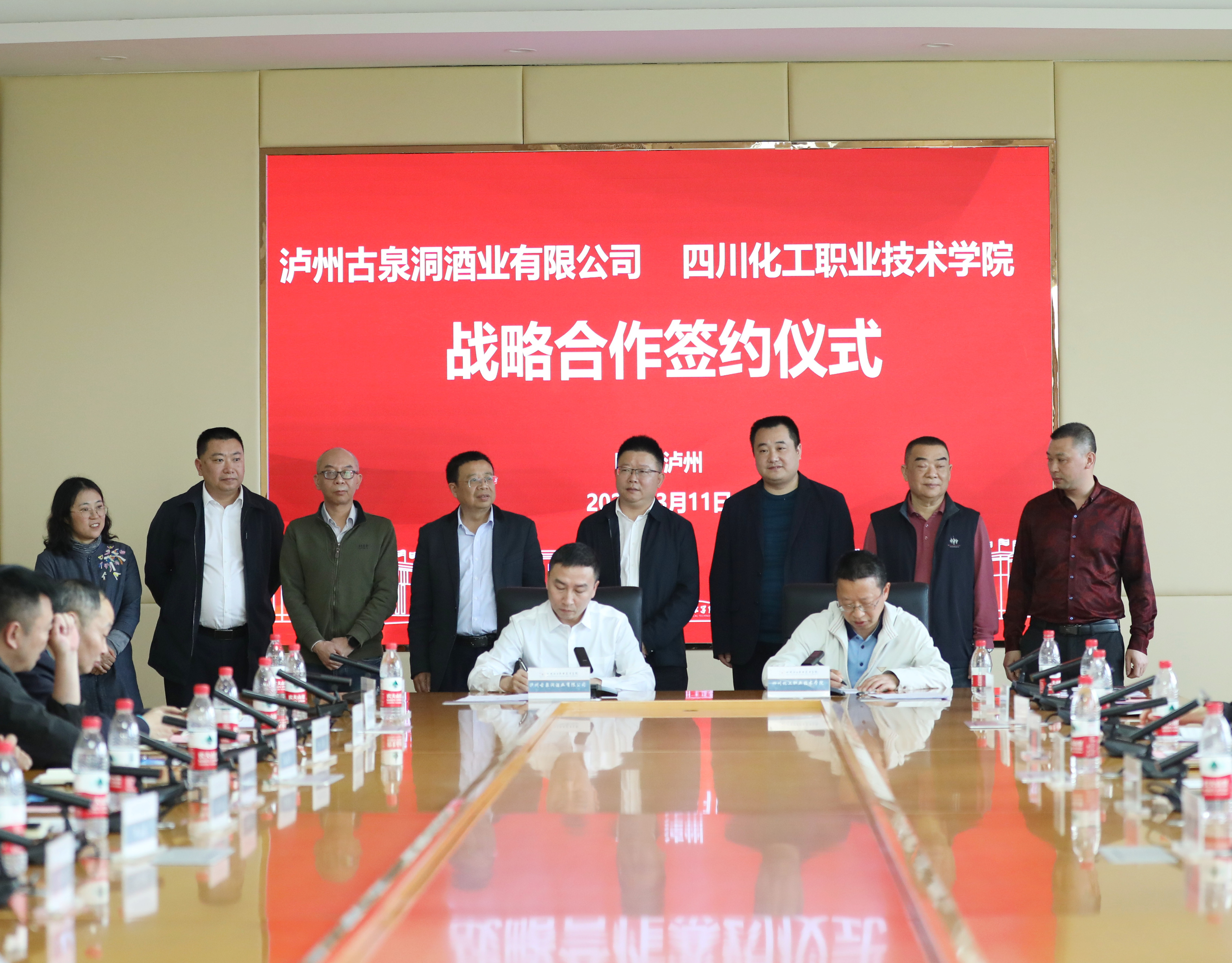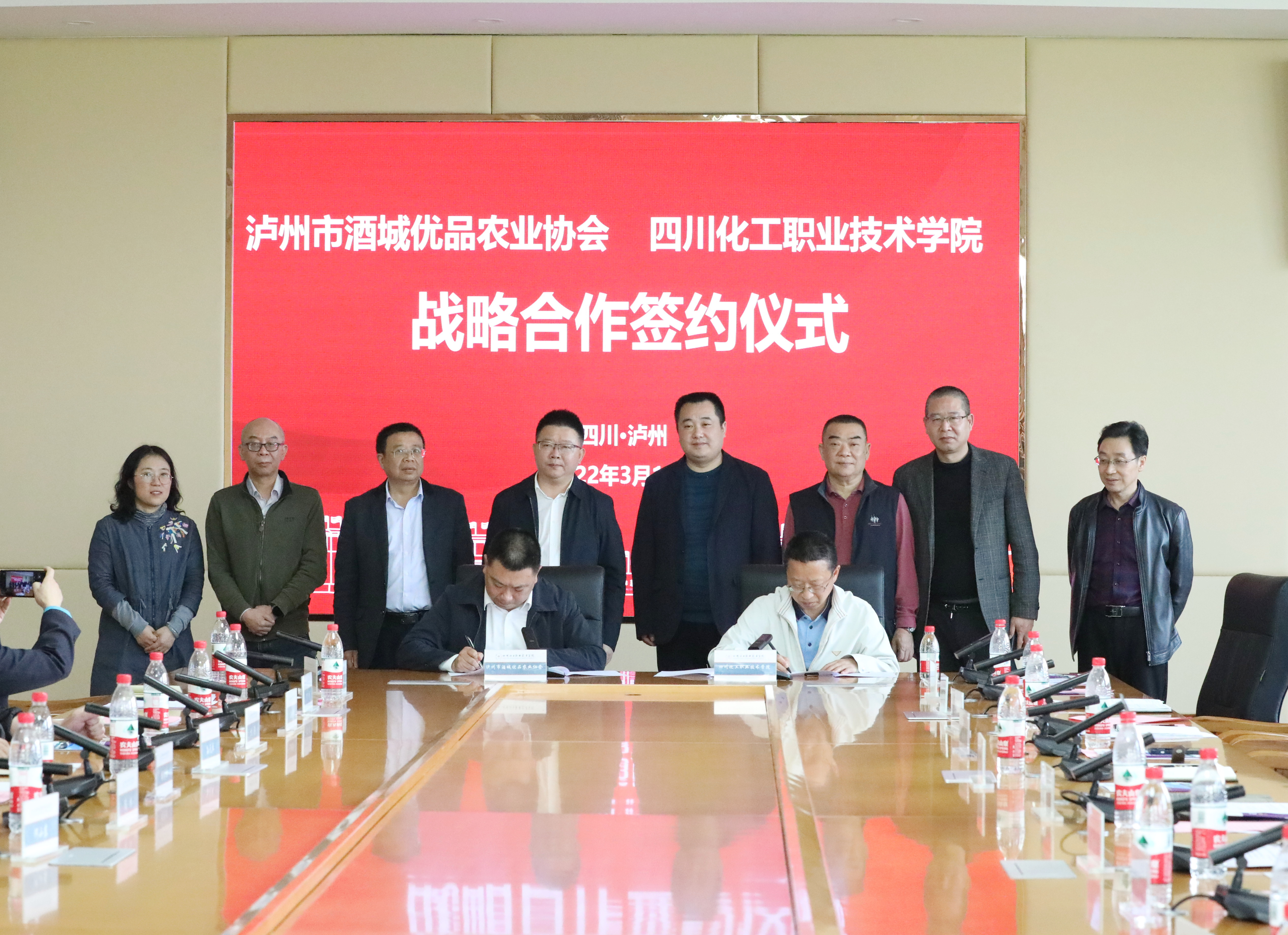 市酒城优品农业协会会员单位、市工商银行总经理柘昭明,学校教务处、科技处、招生就业处、继续教育处、川酒学院负责人参加签约仪式。
