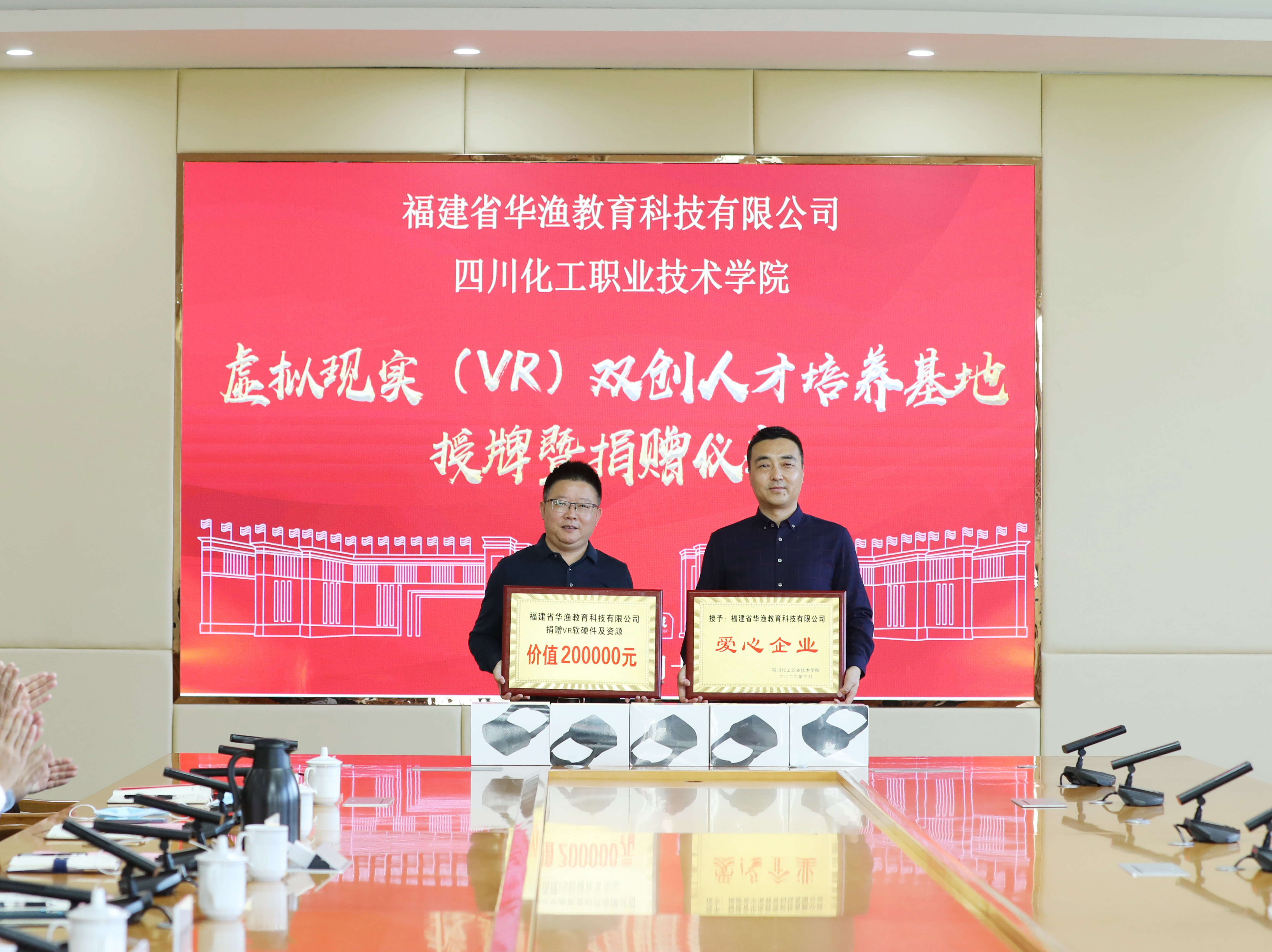 在与会人员的见证下,马文君代表华渔教育授予四川化工职业技术学院“虚拟现实(VR)双创人才培养基地”,并与谢光杰共同签署价值20万元的软硬件及资源捐赠协议,文申柳向华渔教育颁发了爱心企业牌匾。