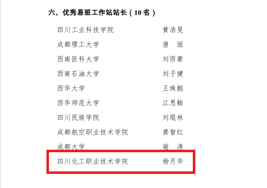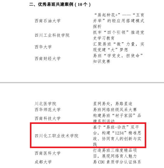 近日,省教育厅公布了四川省易班共建高校评选活动结果,学校被评为“优秀易班共建高校”,这也是学校连续五年获此殊荣;学校报送的《基于“易班-诊改”双平台,构建“1234”精准思政、协同育人的创新与实践》入选优秀易班共建案例;学生处陈善娜老师被评为“优秀易班指导教师”,是唯一一位获此殊荣的高职院校教师;陈婷婷老师被评为“优秀易班辅导员”;数字经济学院数字媒体应用技术1932班学生杨月华被评为“优秀易班工作站站长”。