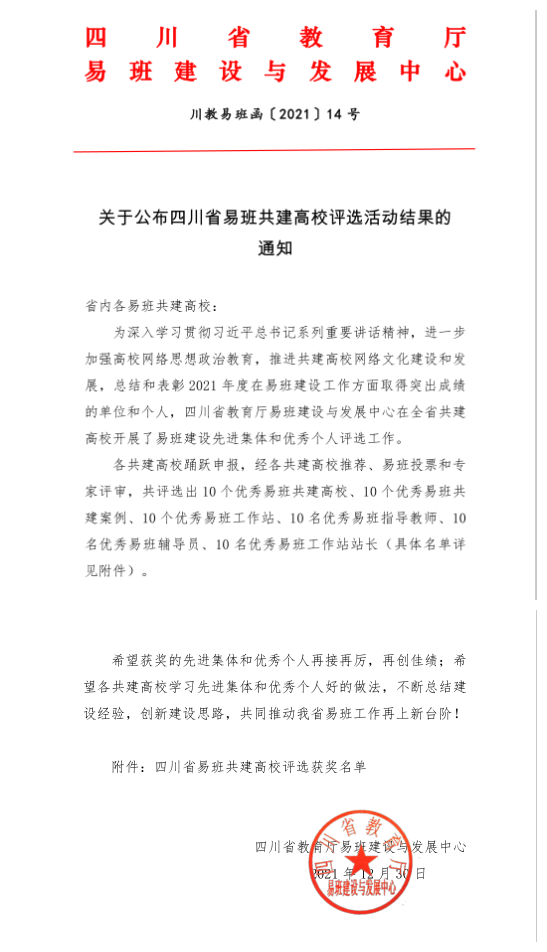 四川省教育厅自2015年开展易班建设以来,学校连续5次被评选为“四川省优秀易班共建高校”,2020年,被教育部评为“全国优秀易班共建高校”,先后有10余所高校来学校交流学习易班建设经验。在2021年四川省易班建设先进集体和优秀个人评选工作中,全省每所高校最多可申报6项,学校荣获5项大奖,是全省高职院校中获奖最多的学校。 2021年,在学校党委的正确领导下,在相关部门的大力支持和密切配合下,学校易班工作始终围绕立德树人根本任务,聚焦思想引领,根据易班网络平台的特点及新时代高职学生的特点,将“易班”建设成为富有高职特色、化院特点、时代特征,集思政教育、教育教学、生活服务、文化娱乐为一体的高职大学生网络育人平台,有效地吸引学生、留住学生、引领学生,学校易班共建指数和活跃指数一直在全省易班共建高校中名列前茅。学校将以此次获奖为新的起点,继续深入学习贯彻习近平总书记系列重要讲话精神,进一步加强网络思想政治教育,推进共建学校网络文化建设和发展,不断总结建设经验,创新建设思路,共同推动学校易班工作再上新台阶。