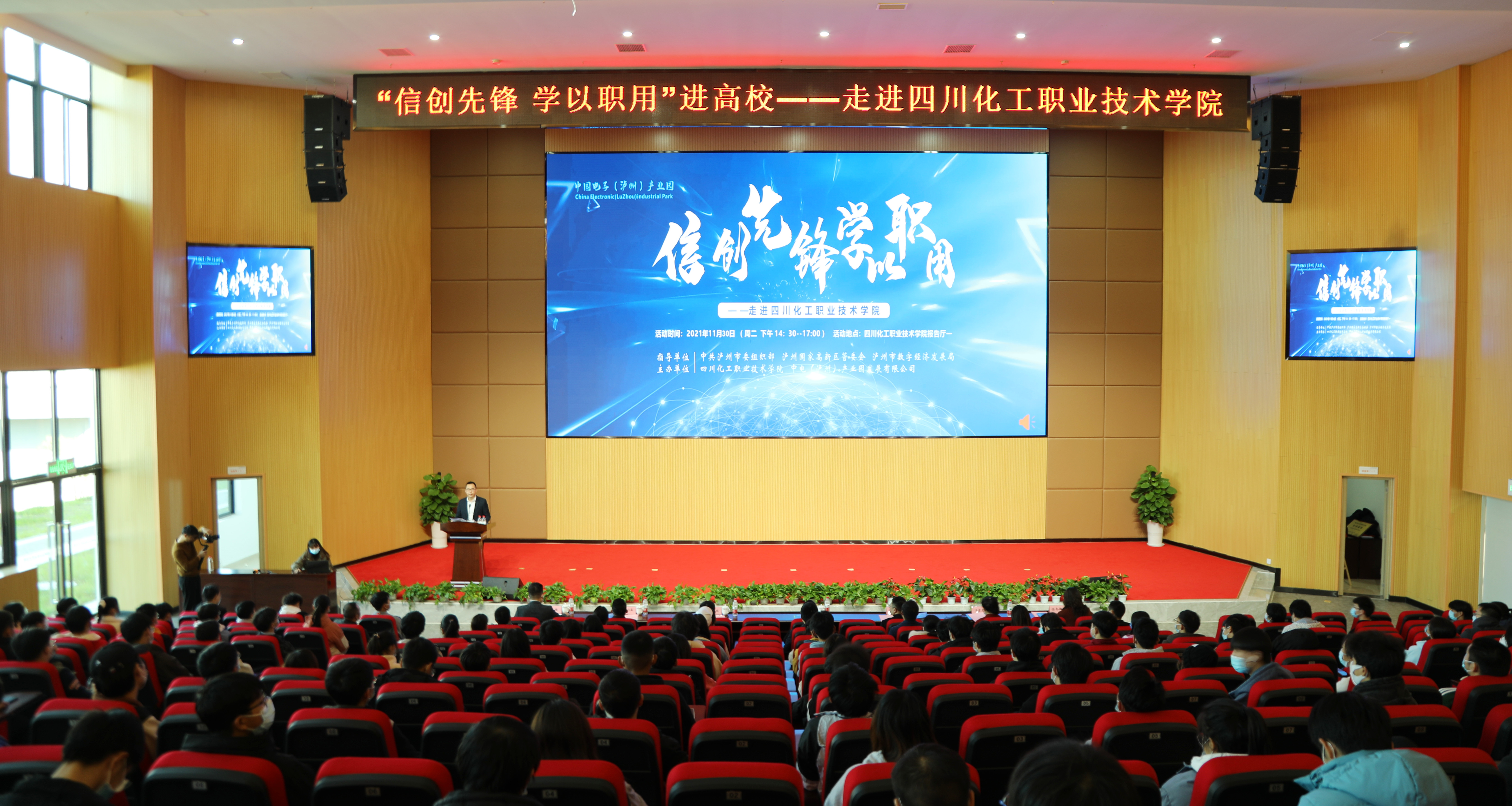 11月30日下午,由中共泸州市委组织部、泸州国家高新区管委会、市数字经济发展局指导,中电(泸州)产业园发展有限公司和学校联合主办的“信创先锋 学以职用”进高校系列科普教育活动在第一学术报告厅成功举行。中共泸州市委组织部部务委员刘海涛,市数字经济发展局副局长黄祖鑫,泸州国家高新区管委会组织部副部长姜雪灵,成都信息工程大学网络安全学院书记张仕斌,中国电子(泸州)产业园副总经理刘腾,中国电子系统技术有限公司产业人才发展中心总经理任冬梅,学校党委书记刘志勇,院长助理谢光杰和相关二级学院负责人参加活动。