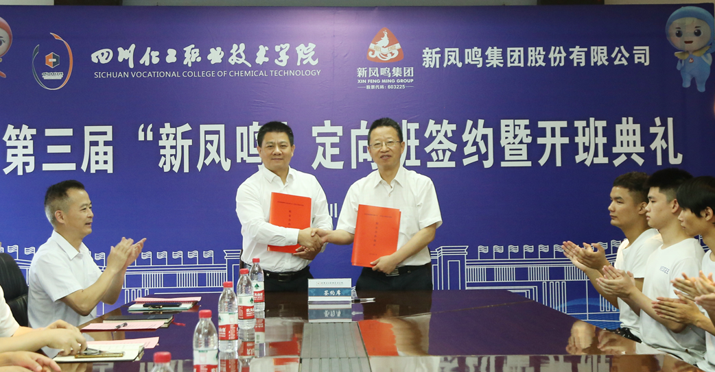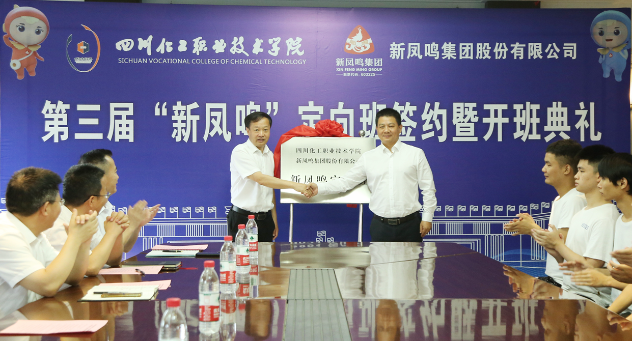 开班仪式上,蒲开伦副院长与宋建红总监共同签订了第三届《四川化院——新凤鸣定向班合作协议书》;刘志勇书记与宋建红总监共同为“新凤鸣”定向班揭牌;宋建红总监代表公司向文申柳院长赠送了写着“筑巢引凤 凤自川鸣 共响化音 竭诚同赢”的锦旗。