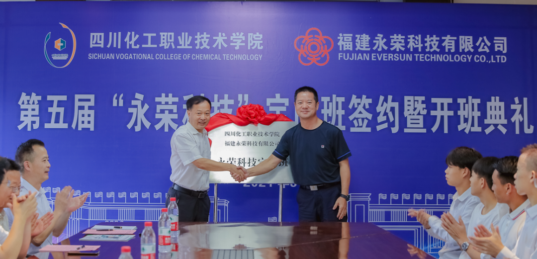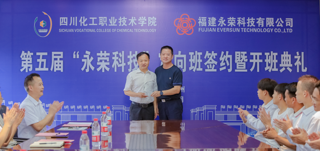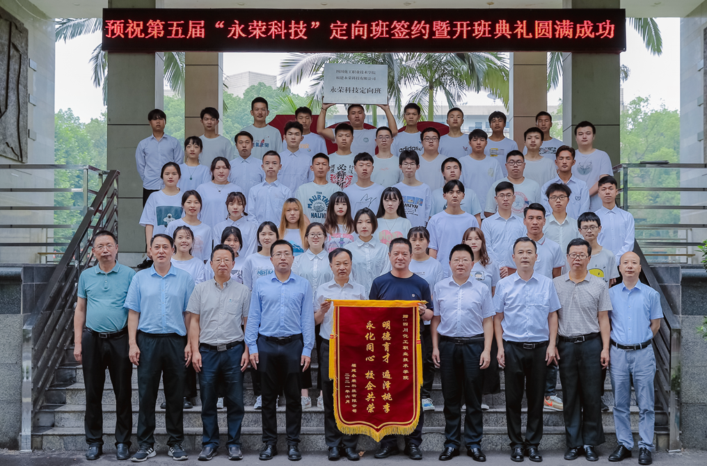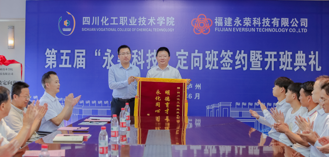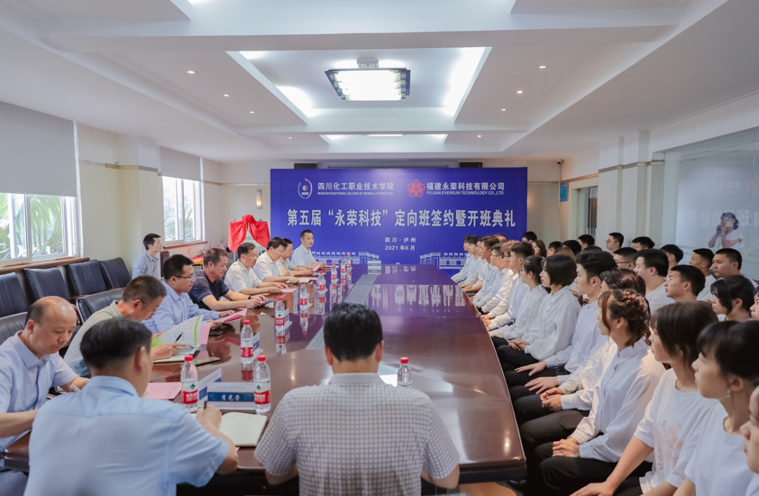 6月24日,经过校企双方共同努力,四川化工职业技术学院与福建永荣科技有限公司全力打造的第五届“永荣科技”定向班(公司为学生减免3年学费)签约暨开班典礼在学校行政楼三楼会议室举行。福建永荣科技有限公司总经理杨立新、人资行政总监杨微,学校党委书记刘志勇、院长文申柳、副院长蒲开伦及50余名“永荣科技”定向班学员代表参加了开班仪式。仪式由招生就业处(校企办)处长罗伦忠主持。
