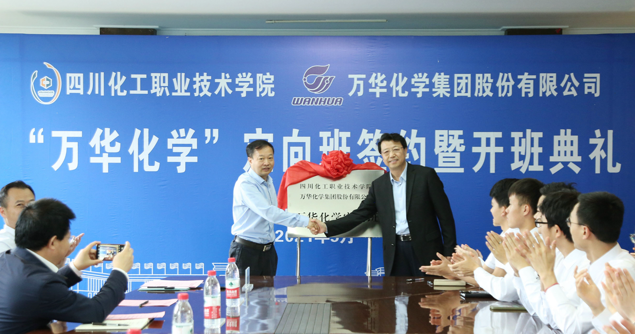 开班仪式上,蒲开伦副院长和赵继德总监共同签订了首届《四川化院——万华化学定向班合作协议书》;刘志勇书记与陈毅峰副总裁共同为“万华化学”定向班揭牌。