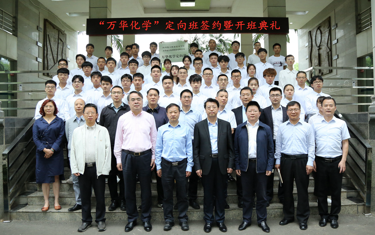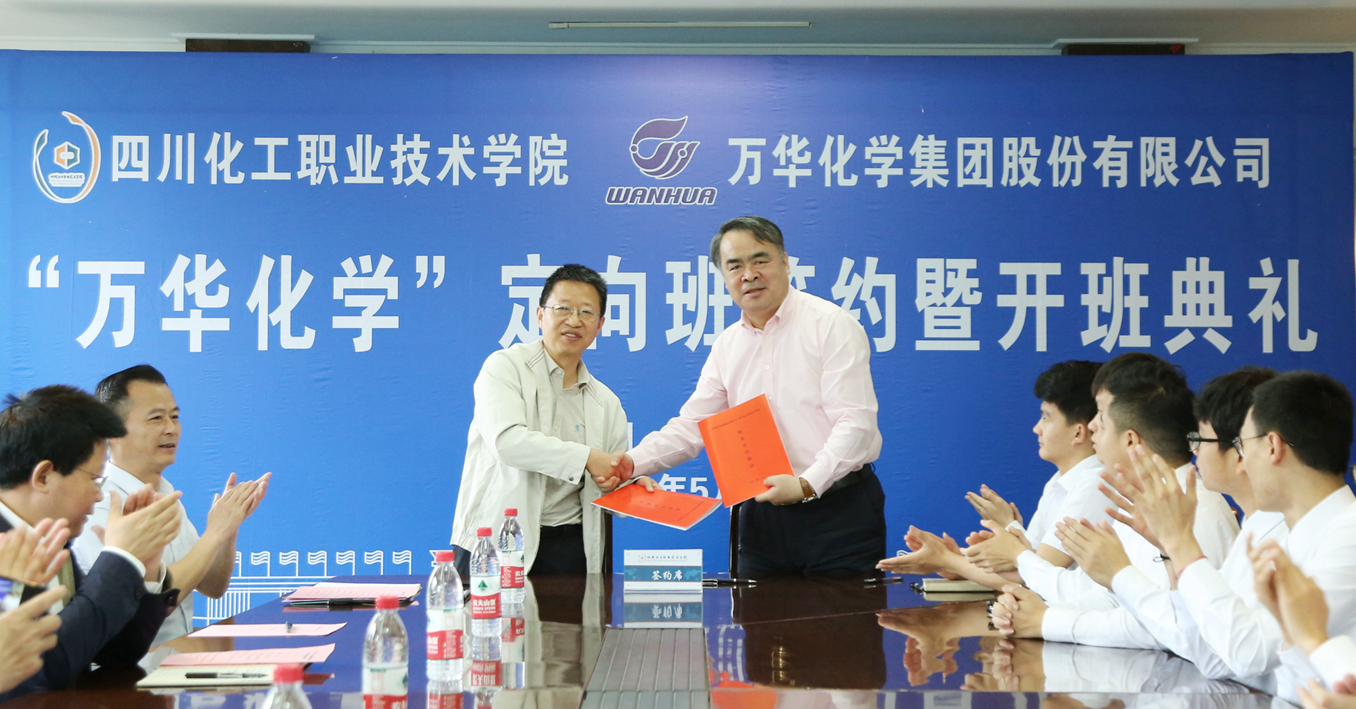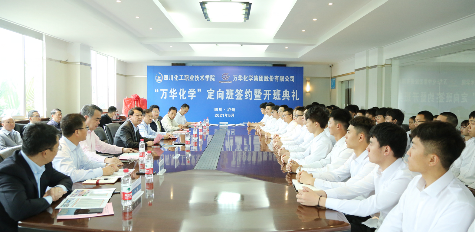 5月24日,学校与万华化学集团股份有限公司共同打造的“万华化学”定向班签约暨开班典礼在行政楼三楼会议室隆重举行。万华化学集团股份有限公司高级副总裁陈毅峰、高级人力资源总监赵继德、集团招聘经理白朔、万华化学四川基地副总经理薛锋,学校党委书记刘志勇、院长文申柳、副院长蒲开伦及签约万华化学定向班的40余名学生代表参加了签约仪式。招生就业处(校企办)处长罗伦忠主持开班典礼。
